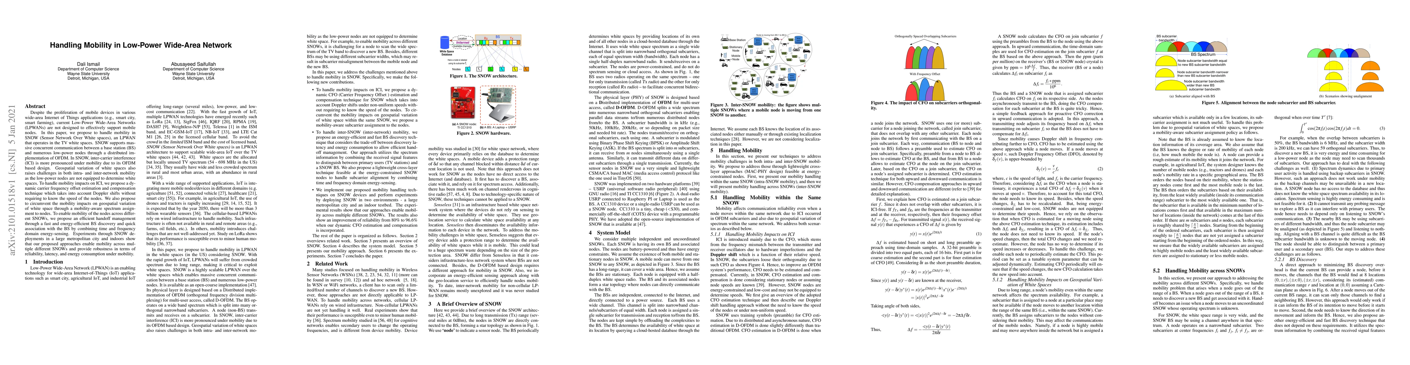 Despite the proliferation of mobile devices in various wide-area Internet of Things applications (e.g., smart city, smart farming), current Low-Power Wide-Area Networks (LPWANs) are not designed to effectively support mobile nodes. In this paper, we propose to handle mobility in SNOW (Sensor Network Over White spaces), an LPWAN that operates in the TV white spaces. SNOW supports massive concurrent communication between a base station (BS) and numerous low-power nodes through a distributed implementation of OFDM. In SNOW, inter-carrier interference (ICI) is more pronounced under mobility due to its OFDM based design. Geospatial variation of white spaces also raises challenges in both intra- and inter-network mobility as the low-power nodes are not equipped to determine white spaces. To handle mobility impacts on ICI, we propose a dynamic carrier frequency offset estimation and compensation technique which takes into account Doppler shifts without requiring to know the speed of the nodes. We also propose to circumvent the mobility impacts on geospatial variation of white space through a mobility-aware spectrum assignment to nodes. To enable mobility of the nodes across different SNOWs, we propose an efficient handoff management through a fast and energy-efficient BS discovery and quick association with the BS by combining time and frequency domain energy-sensing. Experiments through SNOW deployments in a large metropolitan city and indoors show that our proposed approaches enable mobility across multiple different SNOWs and provide robustness in terms of reliability, latency, and energy consumption under mobility.