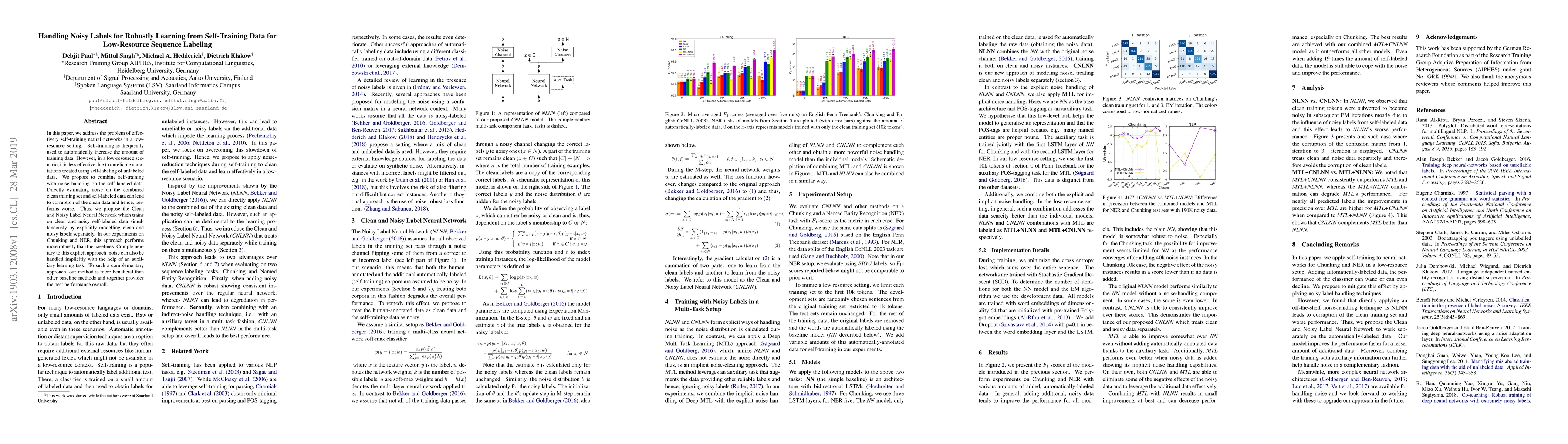 This paper proposes a method to robustly train neural networks for low-resource sequence labeling by combining self-training with noise handling on self-labeled data. It introduces the Clean and Noisy Label Neural Network, which separately models clean and noisy labels, achieving better performance than baselines. Additionally, an auxiliary learning task complements the explicit noise handling, further improving overall performance.