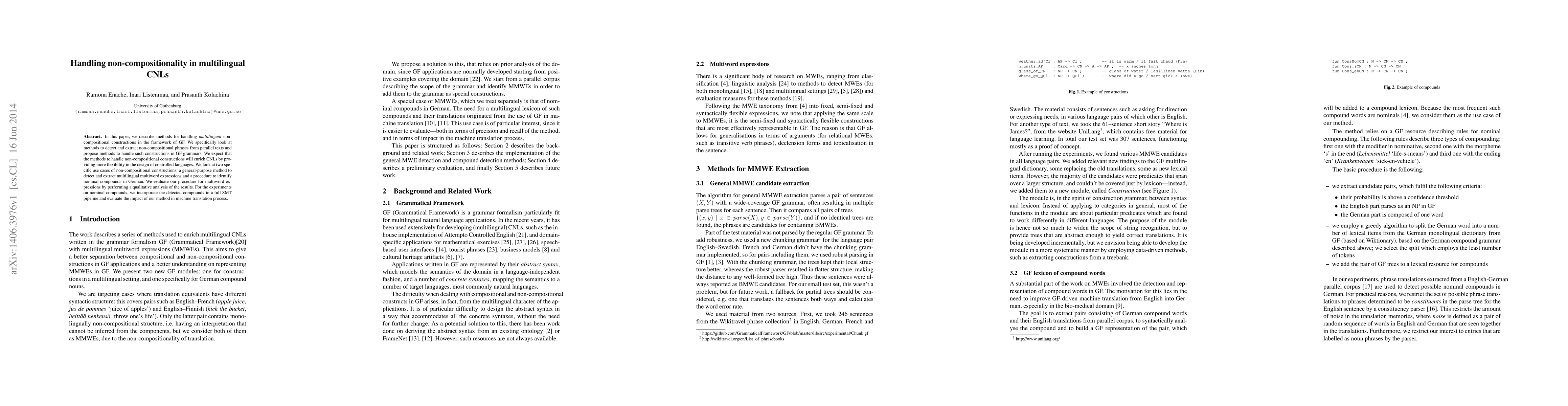 In this paper, we describe methods for handling multilingual non-compositional constructions in the framework of GF. We specifically look at methods to detect and extract non-compositional phrases from parallel texts and propose methods to handle such constructions in GF grammars. We expect that the methods to handle non-compositional constructions will enrich CNLs by providing more flexibility in the design of controlled languages. We look at two specific use cases of non-compositional constructions: a general-purpose method to detect and extract multilingual multiword expressions and a procedure to identify nominal compounds in German. We evaluate our procedure for multiword expressions by performing a qualitative analysis of the results. For the experiments on nominal compounds, we incorporate the detected compounds in a full SMT pipeline and evaluate the impact of our method in machine translation process.