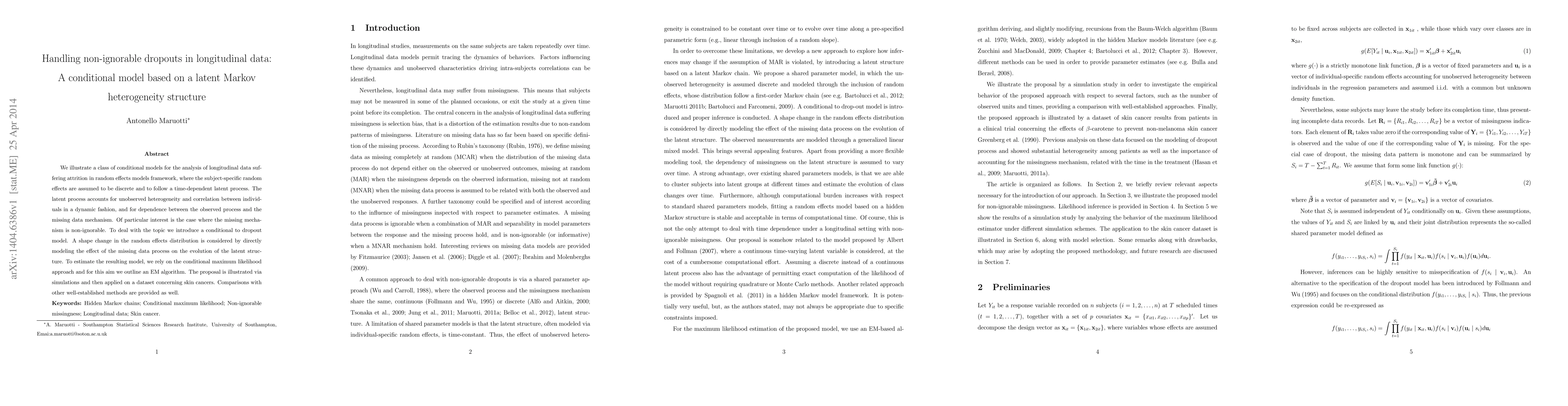 This paper proposes a conditional model to handle non-ignorable dropouts in longitudinal data, using a latent Markov heterogeneity structure to account for unobserved heterogeneity and missing data mechanisms. The model employs a conditional maximum likelihood approach and an EM algorithm for estimation, demonstrated through simulations and a skin cancer dataset.