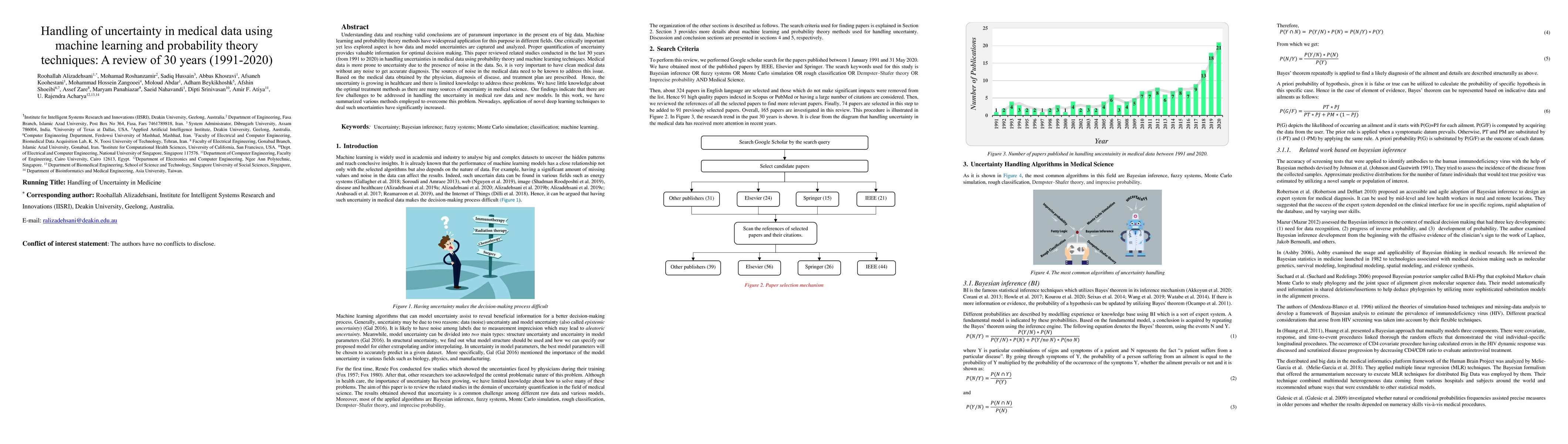Understanding data and reaching valid conclusions are of paramount importance in the present era of big data. Machine learning and probability theory methods have widespread application for this purpose in different fields. One critically important yet less explored aspect is how data and model uncertainties are captured and analyzed. Proper quantification of uncertainty provides valuable information for optimal decision making. This paper reviewed related studies conducted in the last 30 years (from 1991 to 2020) in handling uncertainties in medical data using probability theory and machine learning techniques. Medical data is more prone to uncertainty due to the presence of noise in the data. So, it is very important to have clean medical data without any noise to get accurate diagnosis. The sources of noise in the medical data need to be known to address this issue. Based on the medical data obtained by the physician, diagnosis of disease, and treatment plan are prescribed. Hence, the uncertainty is growing in healthcare and there is limited knowledge to address these problems. We have little knowledge about the optimal treatment methods as there are many sources of uncertainty in medical science. Our findings indicate that there are few challenges to be addressed in handling the uncertainty in medical raw data and new models. In this work, we have summarized various methods employed to overcome this problem. Nowadays, application of novel deep learning techniques to deal such uncertainties have significantly increased.