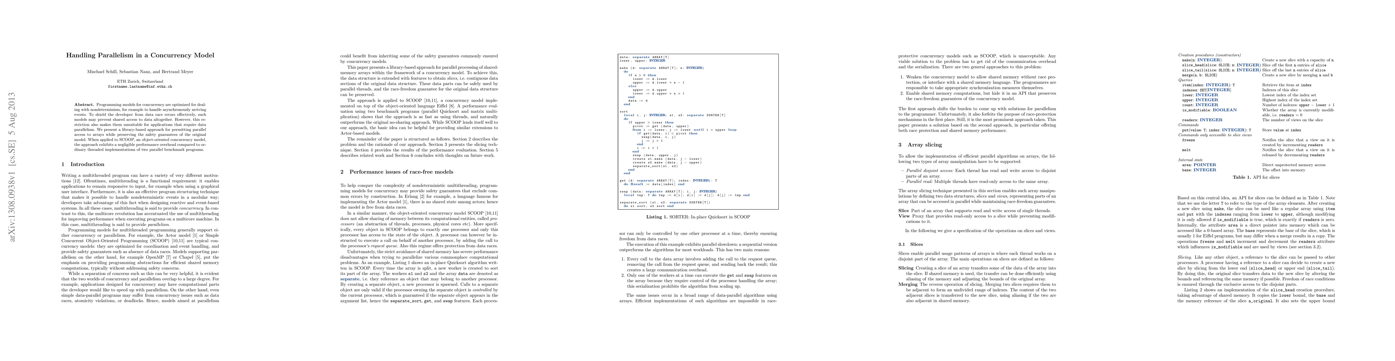 This paper proposes a library-based method to allow parallel access to arrays in a concurrency model like SCOOP while maintaining safety from data race errors, demonstrating minimal performance overhead compared to traditional threaded implementations.