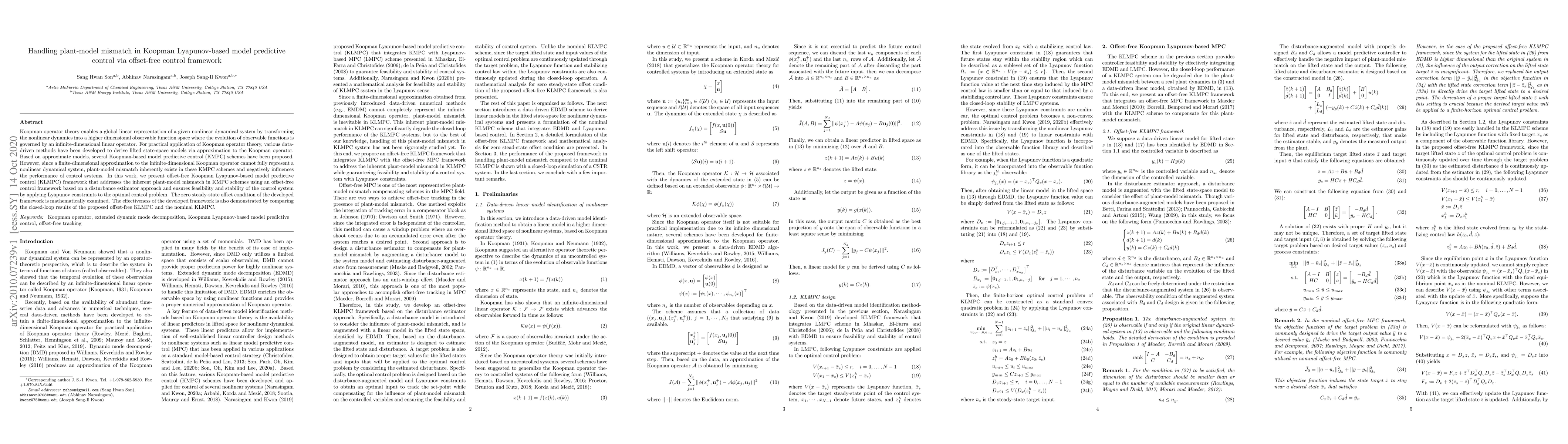 Koopman operator theory enables a global linear representation of a given nonlinear dynamical system by transforming the nonlinear dynamics into a higher dimensional observable function space where the evolution of observable functions is governed by an infinite-dimensional linear operator. For practical application of Koopman operator theory, various data-driven methods have been developed to derive lifted state-space models via approximation to the Koopman operator. Based on approximate models, several Koopman-based model predictive control (KMPC) schemes have been proposed. However, since a finite-dimensional approximation to the infinite-dimensional Koopman operator cannot fully represent a nonlinear dynamical system, plant-model mismatch inherently exists in these KMPC schemes and negatively influences the performance of control systems. In this work, we present offset-free Koopman Lyapunov-based model predictive control (KLMPC) framework that addresses the inherent plant-model mismatch in KMPC schemes using an offset-free control framework based on a disturbance estimator approach and ensures feasibility and stability of the control system by applying Lyapunov constraints to the optimal control problem. The zero steady-state offset condition of the developed framework is mathematically examined. The effectiveness of the developed framework is also demonstrated by comparing the closed-loop results of the proposed offset-free KLMPC and the nominal KLMPC.