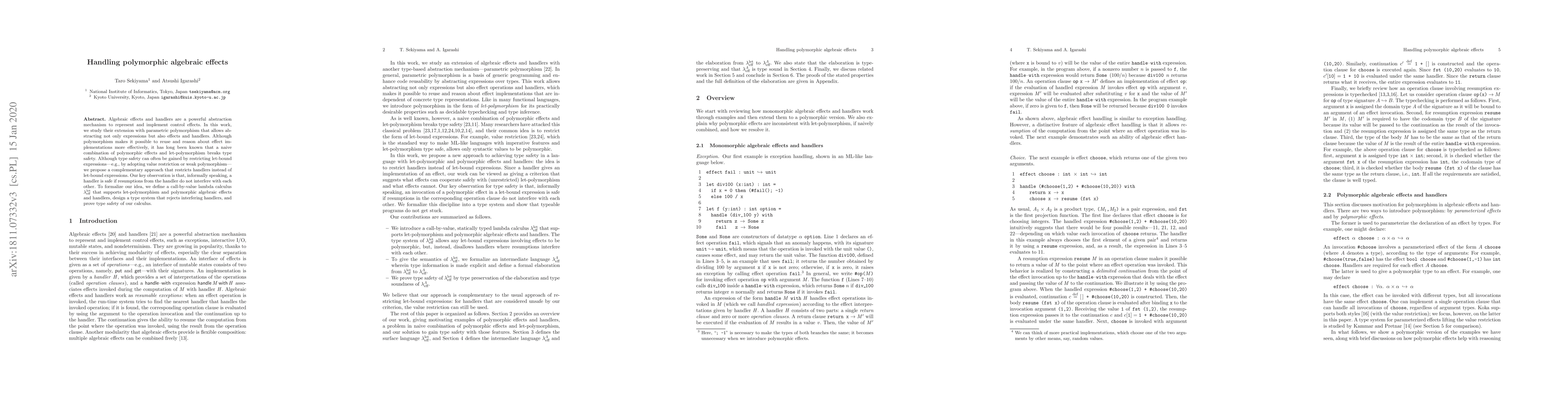 This paper explores extending algebraic effects and handlers with parametric polymorphism to enhance abstraction and reuse. It proposes a novel type system that restricts handlers rather than let-bound expressions to maintain type safety, while allowing let-polymorphism, and proves the type safety of the resulting calculus.