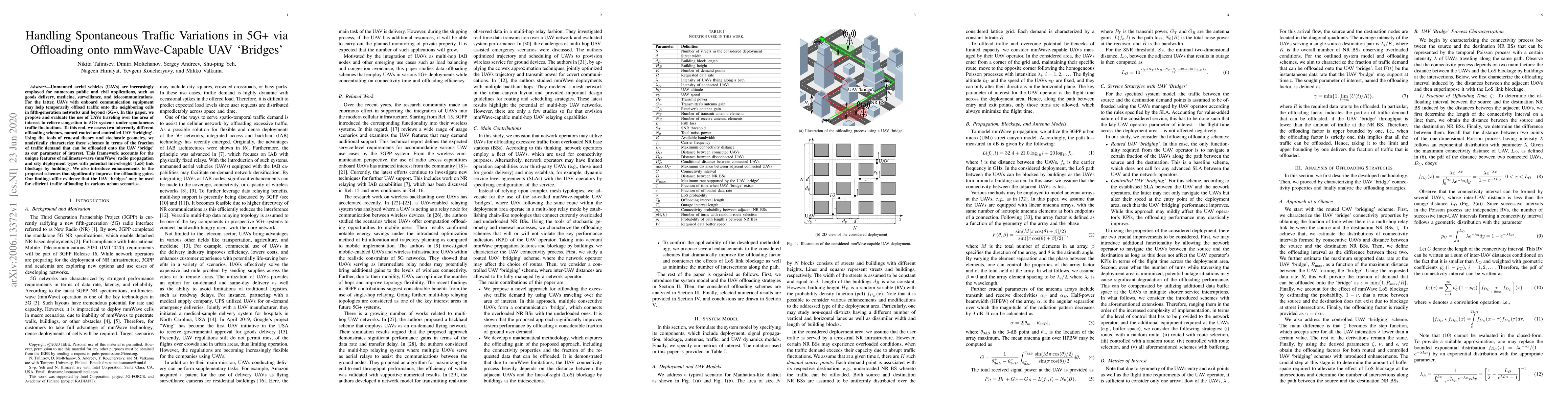 This paper proposes using UAVs as "bridges" to offload traffic in 5G+ networks during spontaneous traffic fluctuations, evaluating two offloading schemes: routed and controlled bridging. Analytical models based on renewal theory and stochastic geometry show that UAVs can efficiently manage traffic variations, especially in urban environments with mmWave propagation challenges.