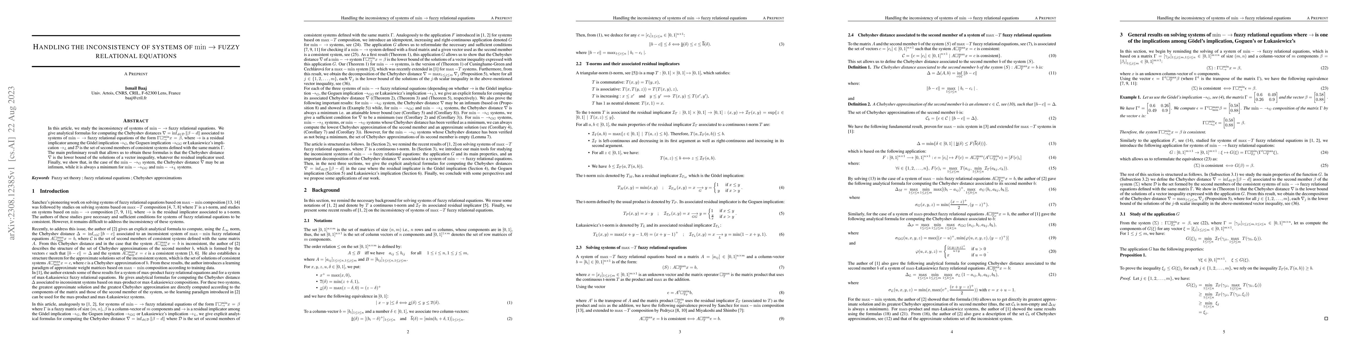In this article, we study the inconsistency of systems of $\min-\rightarrow$ fuzzy relational equations. We give analytical formulas for computing the Chebyshev distances $\nabla = \inf_{d \in \mathcal{D}} \Vert \beta - d \Vert$ associated to systems of $\min-\rightarrow$ fuzzy relational equations of the form $\Gamma \Box_{\rightarrow}^{\min} x = \beta$, where $\rightarrow$ is a residual implicator among the G\"odel implication $\rightarrow_G$, the Goguen implication $\rightarrow_{GG}$ or Lukasiewicz's implication $\rightarrow_L$ and $\mathcal{D}$ is the set of second members of consistent systems defined with the same matrix $\Gamma$. The main preliminary result that allows us to obtain these formulas is that the Chebyshev distance $\nabla$ is the lower bound of the solutions of a vector inequality, whatever the residual implicator used. Finally, we show that, in the case of the $\min-\rightarrow_{G}$ system, the Chebyshev distance $\nabla$ may be an infimum, while it is always a minimum for $\min-\rightarrow_{GG}$ and $\min-\rightarrow_{L}$ systems.