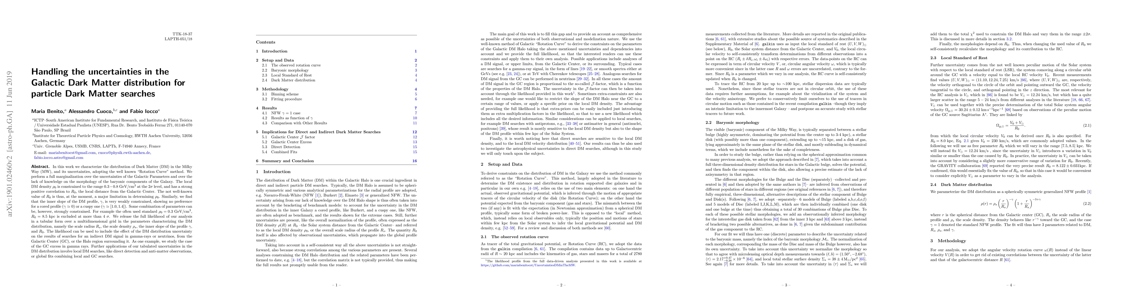 The paper presents a detailed statistical treatment of Dark Matter distribution uncertainties in the Milky Way, mapping degeneracies among parameters and providing a 4-dimensional likelihood table listing χ² values over a grid in γ, R0, Rs, and ρs, with baryonic physics and related uncertainties already marginalized away.