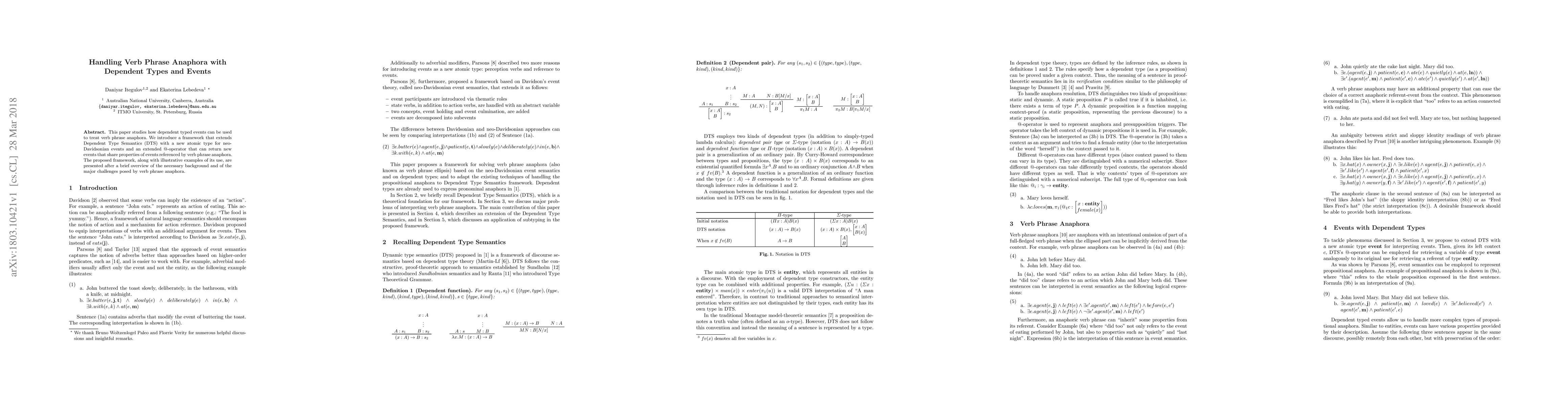 This work stands out by integrating dependent types and events to address verb phrase anaphora, a previously under-explored area in computational linguistics.