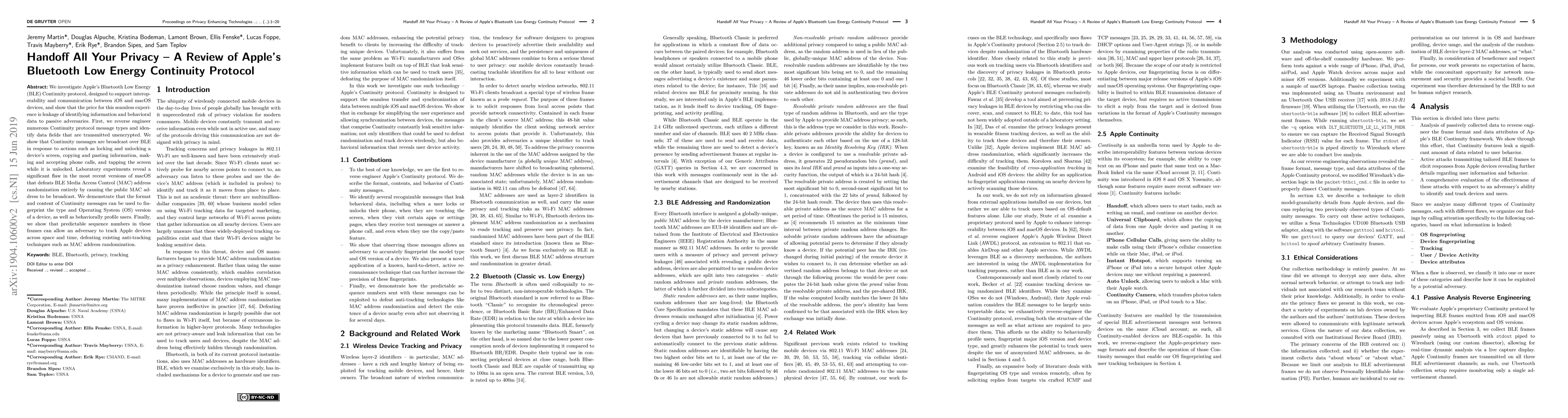 This paper investigates Apple's BLE Continuity protocol, revealing significant privacy leaks due to unencrypted transmissions of identifying and behavioral data. It demonstrates vulnerabilities that allow adversaries to fingerprint devices and track users across time and space, undermining existing anti-tracking measures.