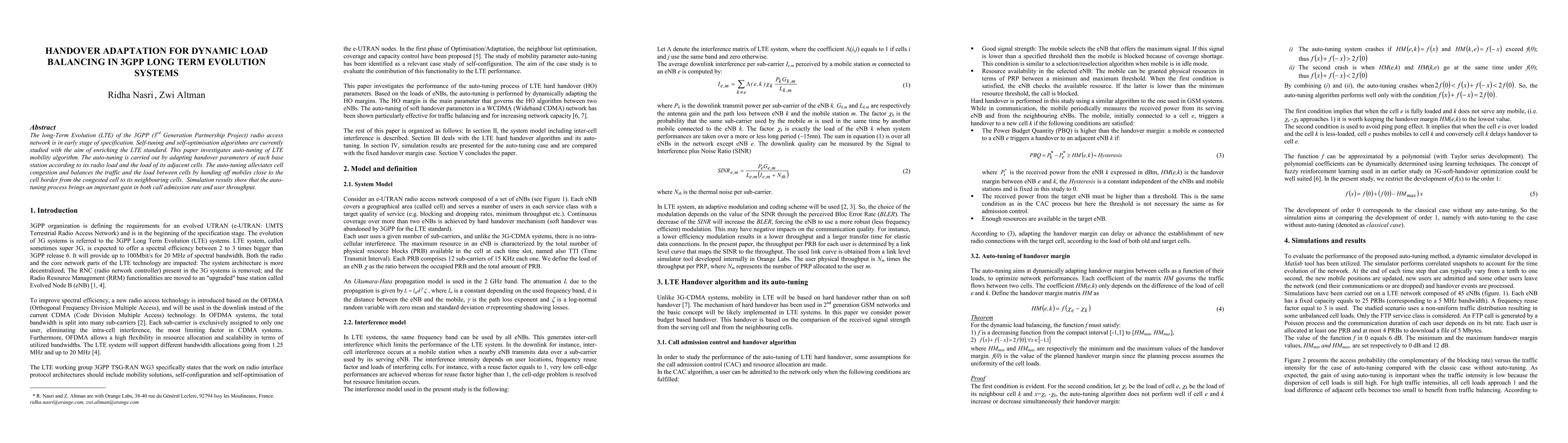 This paper explores adaptive handover parameters in LTE networks to dynamically balance load and alleviate congestion. Simulation results demonstrate significant improvements in call admission rate and user throughput through this auto-tuning approach.