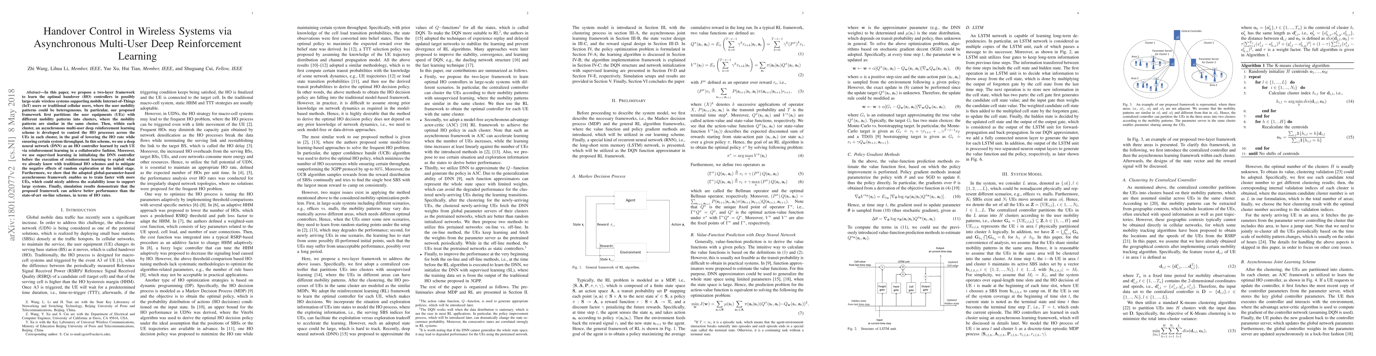 This paper proposes a two-layer framework for optimal handover control in large-scale wireless systems using asynchronous multi-user deep reinforcement learning. It clusters users with similar mobility patterns and employs a deep neural network for collaborative handover control to reduce handover rates while maintaining system throughput.