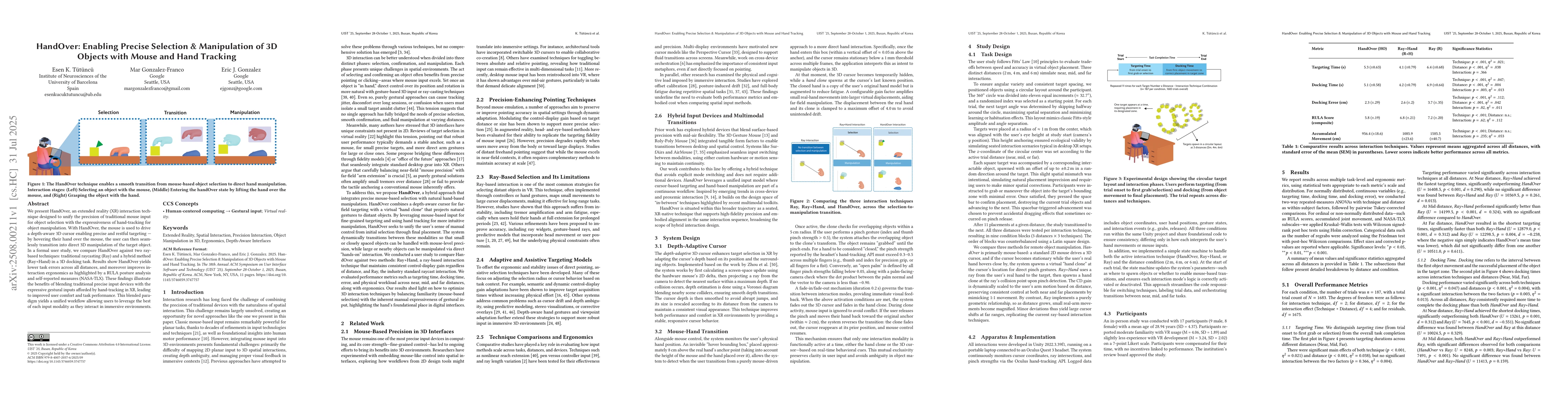 We present HandOver, an extended reality (XR) interaction technique designed to unify the precision of traditional mouse input for object selection with the expressiveness of hand-tracking for object manipulation. With HandOver, the mouse is used to drive a depth-aware 3D cursor enabling precise and restful targeting -by hovering their hand over the mouse, the user can then seamlessly transition into direct 3D manipulation of the target object. In a formal user study, we compare HandOver against two raybased techniques: traditional raycasting (Ray) and a hybrid method (Ray+Hand) in a 3D docking task. Results show HandOver yields lower task errors across all distances, and moreover improves interaction ergonomics as highlighted by a RULA posture analysis and self-reported measures (NASA-TLX). These findings illustrate the benefits of blending traditional precise input devices with the expressive gestural inputs afforded by hand-tracking in XR, leading to improved user comfort and task performance. This blended paradigm yields a unified workflow allowing users to leverage the best of each input modality as they interact in immersive environments.