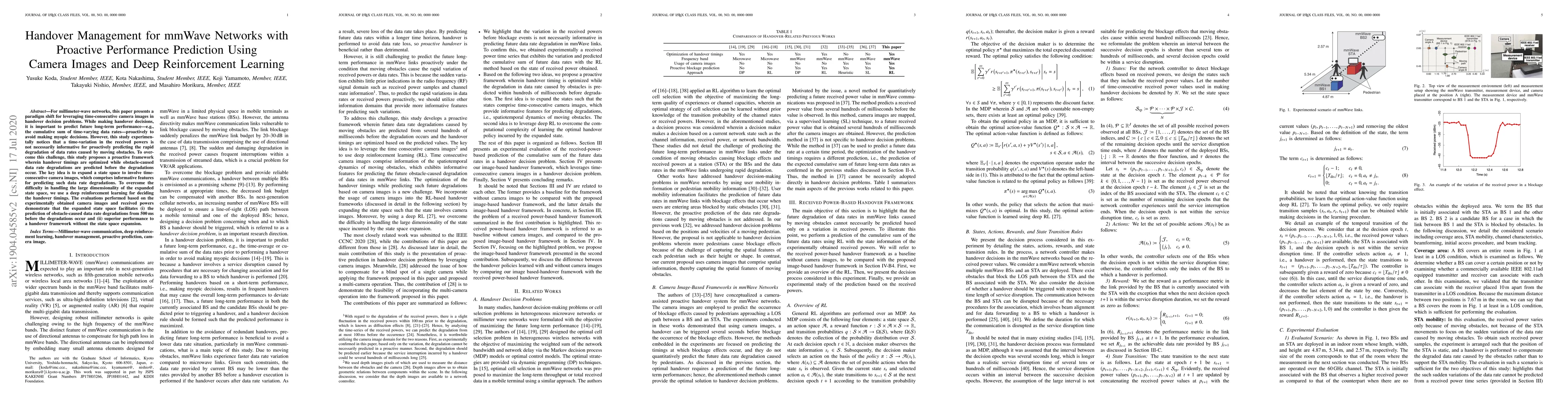 This paper proposes a proactive handover management framework for mmWave networks using time-consecutive camera images and deep reinforcement learning to predict and optimize handover timings, thereby avoiding rapid data rate degradations caused by moving obstacles. The expanded state space incorporating camera images enhances predictive accuracy and outperforms traditional handover methods.