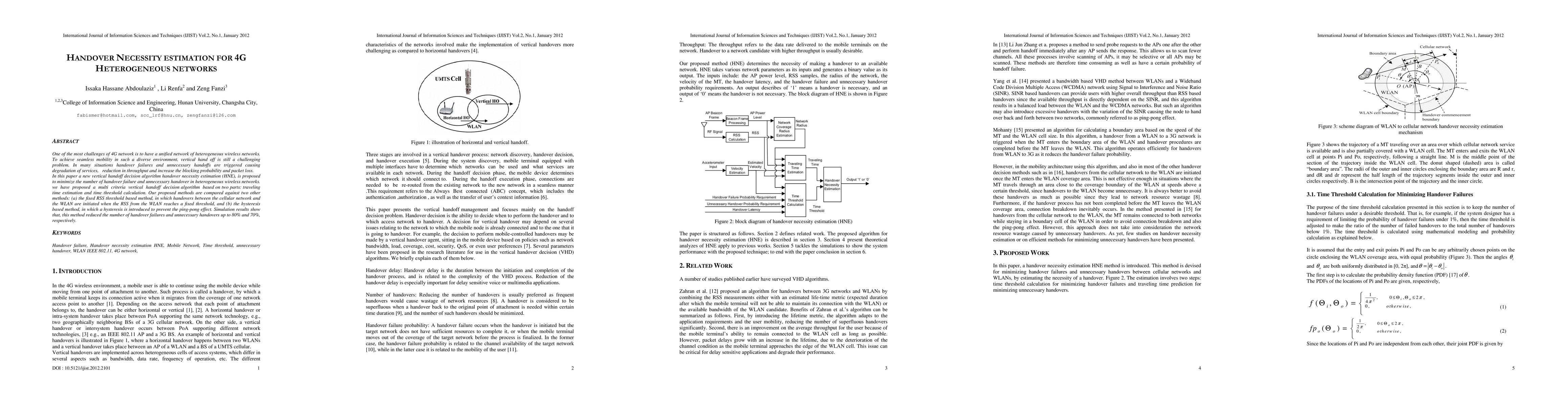 This paper proposes a new vertical handoff decision algorithm called Handover Necessity Estimation (HNE) to minimize handover failures and unnecessary handovers in 4G heterogeneous networks. The HNE method uses traveling time estimation and time threshold calculation, outperforming fixed RSS threshold and hysteresis-based methods by reducing handover failures and unnecessary handovers by up to 80% and 70%, respectively.