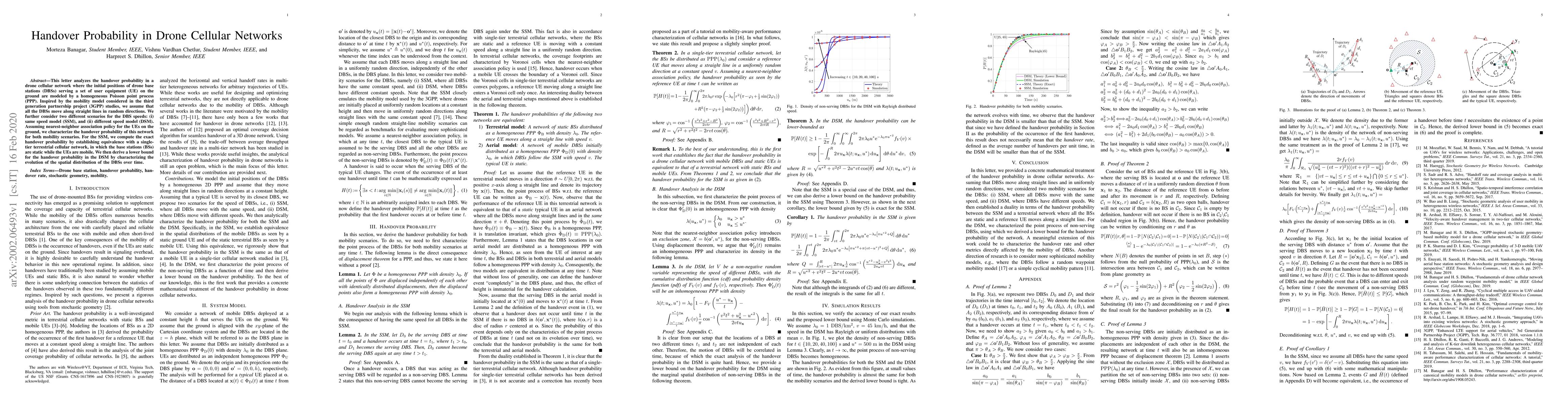 This paper investigates the handover probability in drone cellular networks where drone base stations (DBSs) follow random linear mobility. It characterizes the handover probability under both same and different DBS speed models, establishing an equivalence for the former and deriving a lower bound for the latter.