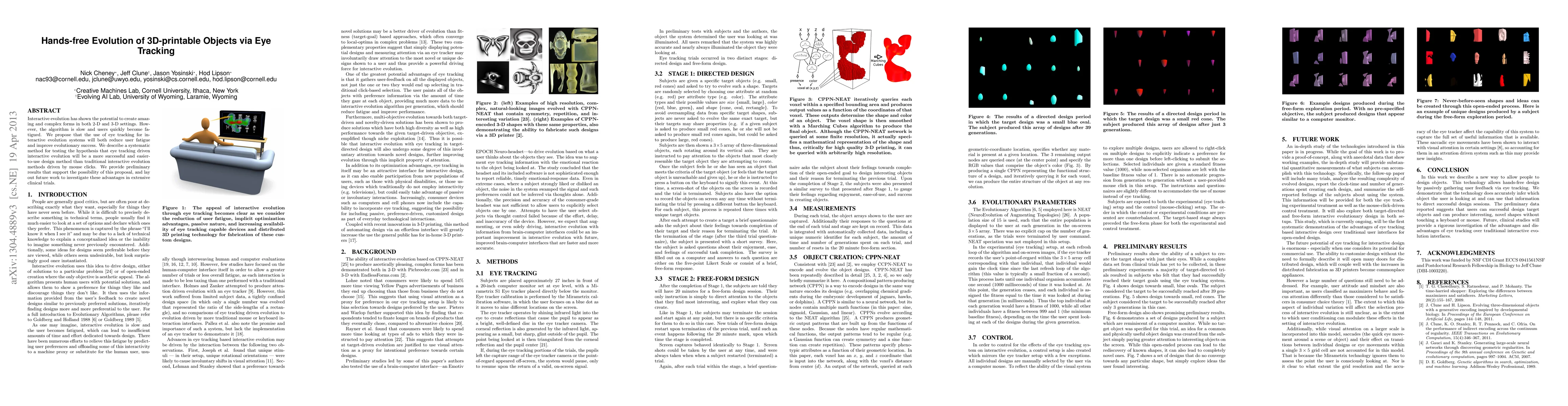 Interactive evolution has shown the potential to create amazing and complex forms in both 2-D and 3-D settings. However, the algorithm is slow and users quickly become fatigued. We propose that the use of eye tracking for interactive evolution systems will both reduce user fatigue and improve evolutionary success. We describe a systematic method for testing the hypothesis that eye tracking driven interactive evolution will be a more successful and easier-to-use design method than traditional interactive evolution methods driven by mouse clicks. We provide preliminary results that support the possibility of this proposal, and lay out future work to investigate these advantages in extensive clinical trials.