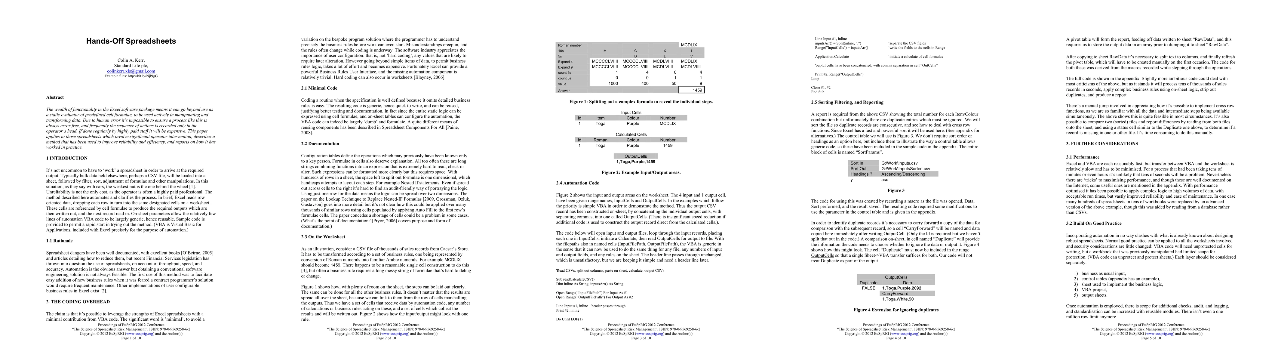 The wealth of functionality in the Excel software package means it can go beyond use as a static evaluator of predefined cell formulae, to be used actively in manipulating and transforming data. Due to human error it is impossible to ensure a process like this is always error free, and frequently the sequence of actions is recorded only in the operator's head. If done regularly by highly paid staff it will be expensive. This paper applies to those spreadsheets which involve significant operator intervention, describes a method that has been used to improve reliability and efficiency, and reports on how it has worked in practice.