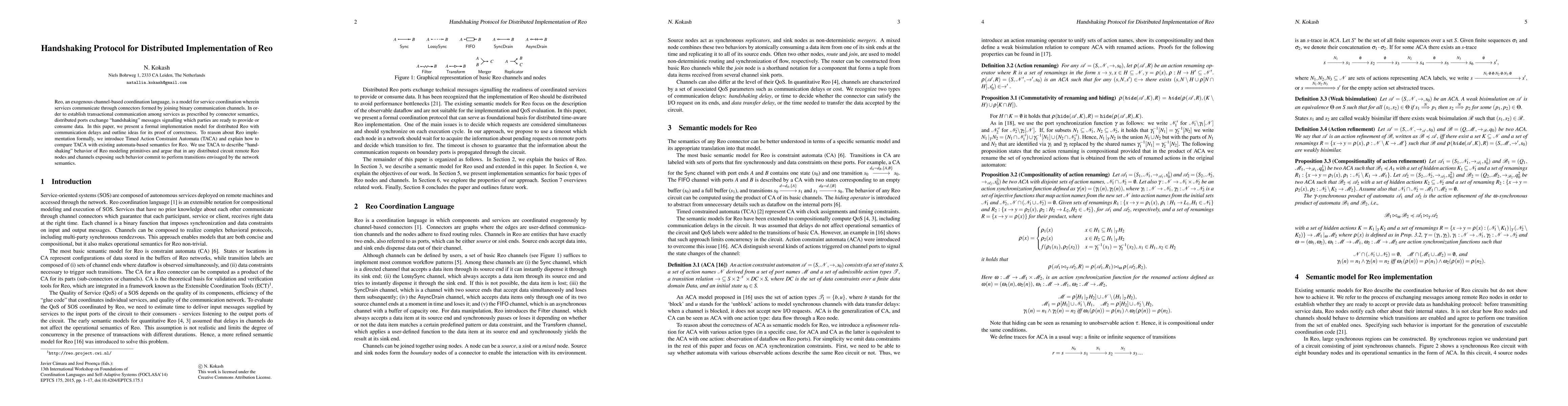 This paper presents a formal implementation model for distributed Reo, introducing Timed Action Constraint Automata (TACA) to describe the handshaking protocol for establishing transactional communication among distributed services. The authors outline ideas for proving the correctness of the model and compare TACA with existing automata-based semantics for Reo.