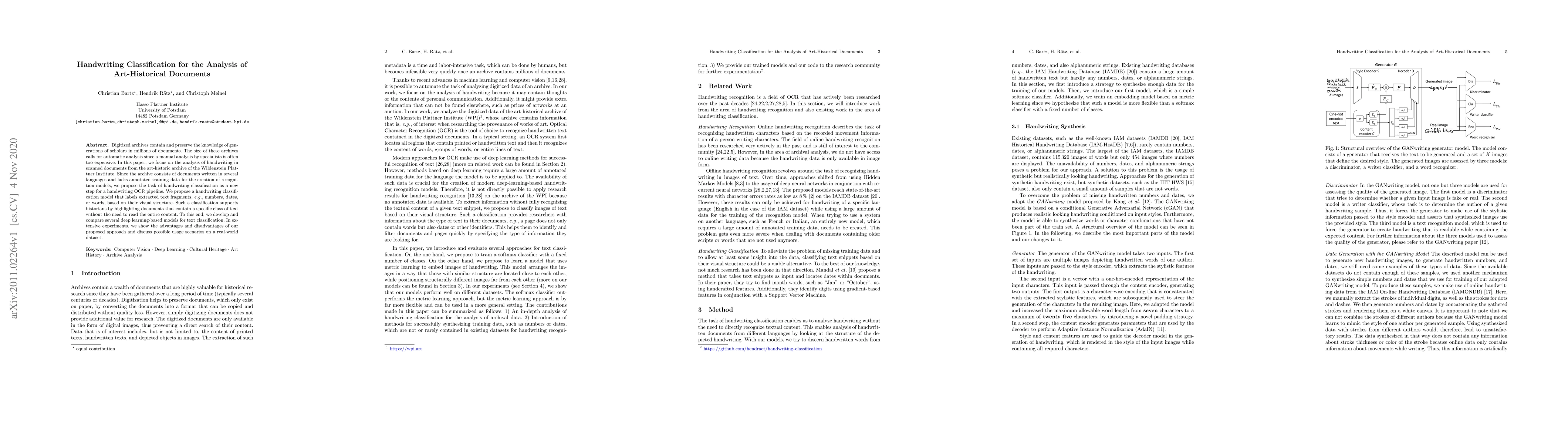 This paper proposes a handwriting classification model for scanned art-historical documents to facilitate automated analysis of large archives. The model labels text fragments based on visual structure, aiding historians in identifying relevant documents without full content reading.