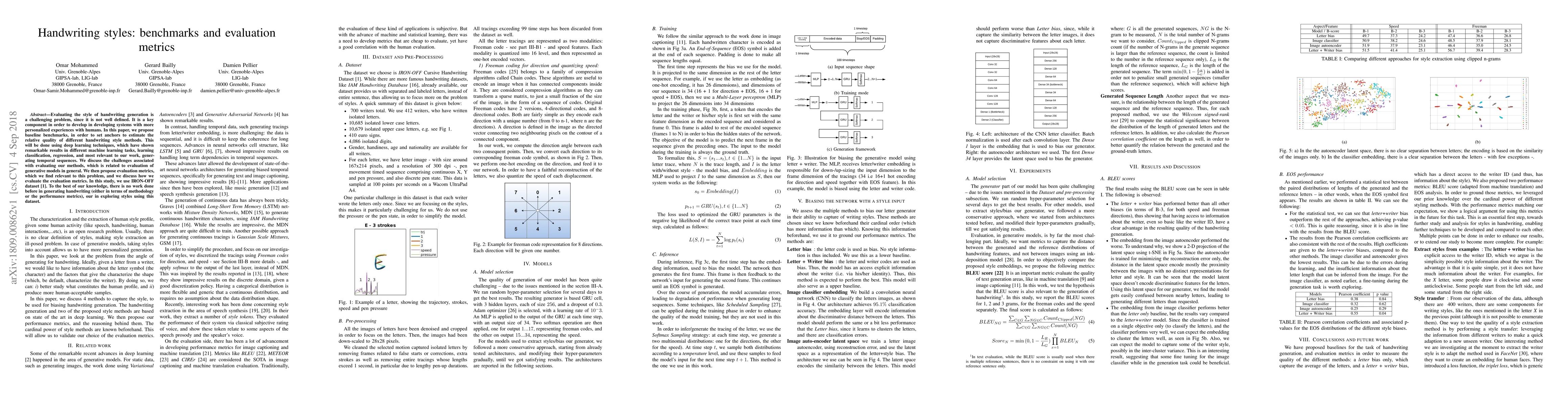 This paper proposes baseline benchmarks and evaluation metrics for assessing the quality of handwriting style generation, utilizing deep learning techniques. It addresses the challenges of evaluating generative models and introduces relevant metrics, using the IRON-OFF dataset to explore handwriting styles, marking the first work in this area.