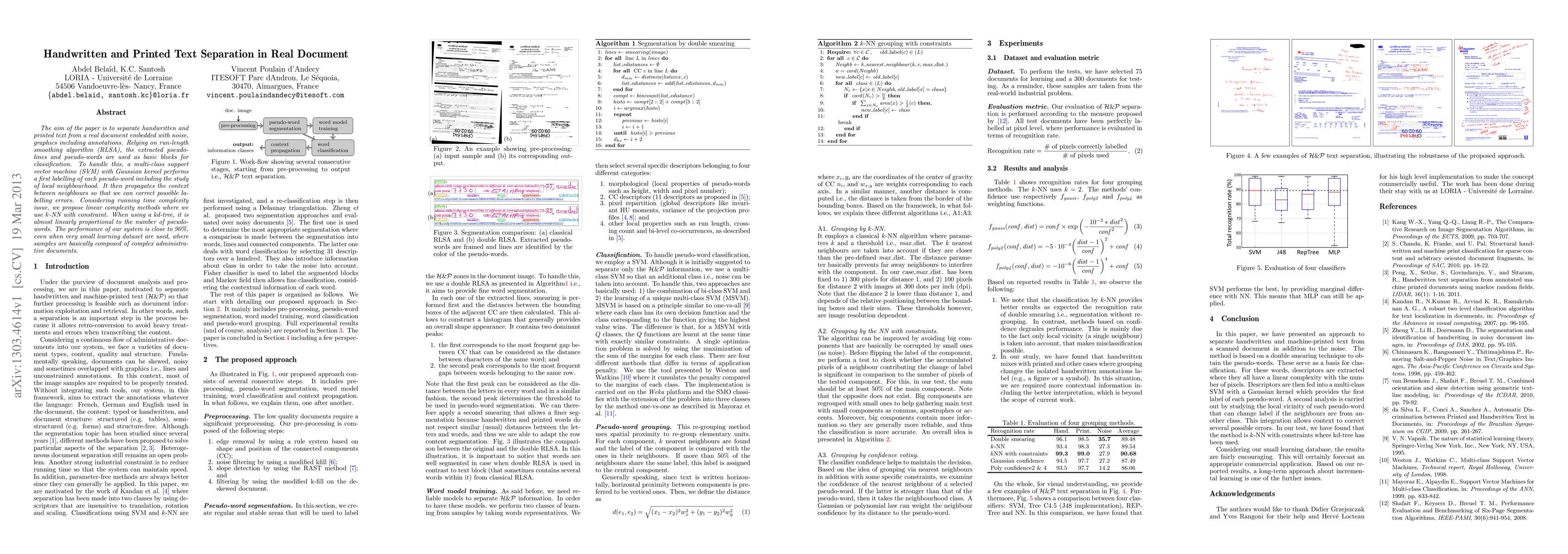 This paper proposes an algorithm for separating handwritten and printed text in complex documents using run-length smoothing and pseudo-line extraction. A multi-class SVM with Gaussian kernel labels pseudo-words, and context propagation corrects errors, achieving nearly 90% accuracy even with limited training data.