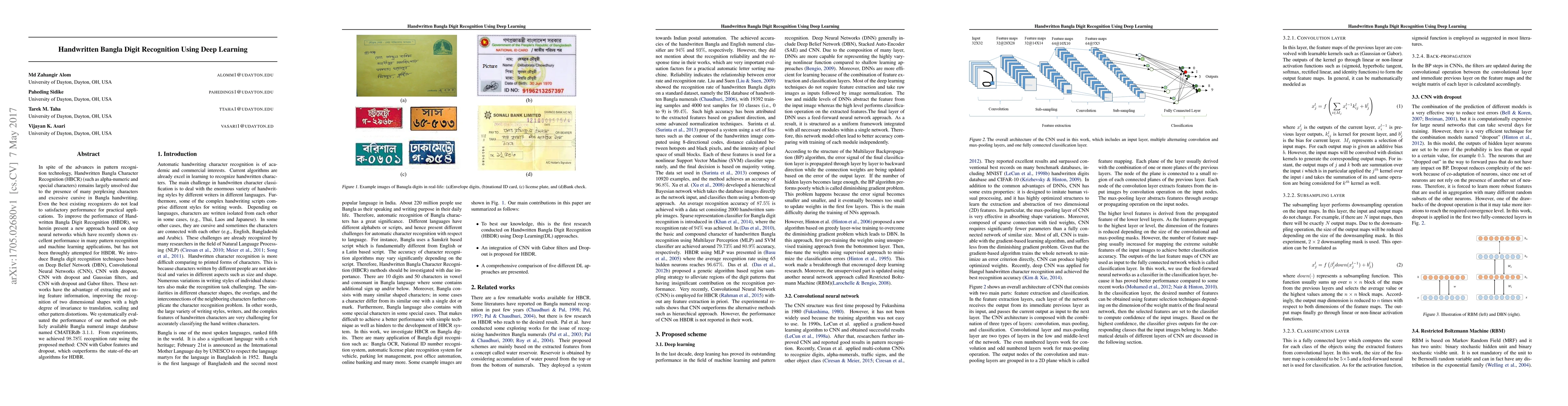 This research presents a new deep learning approach for Handwritten Bangla Digit Recognition (HBDR) using various neural network techniques, achieving a 98.78% recognition rate with a CNN enhanced by dropout and Gabor filters, surpassing existing algorithms. The study demonstrates the effectiveness of deep learning for complex pattern recognition in cursive Bangla handwriting.