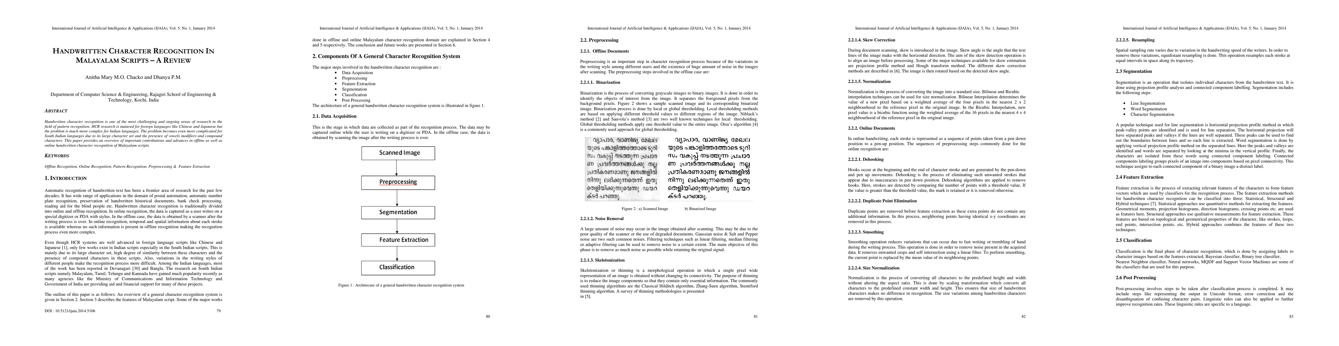 This paper reviews significant advancements in offline and online recognition of Malayalam handwritten characters, highlighting the complexities and unique challenges posed by the script's large character set and compound characters. It emphasizes the progress made in this less-studied South Indian language.
