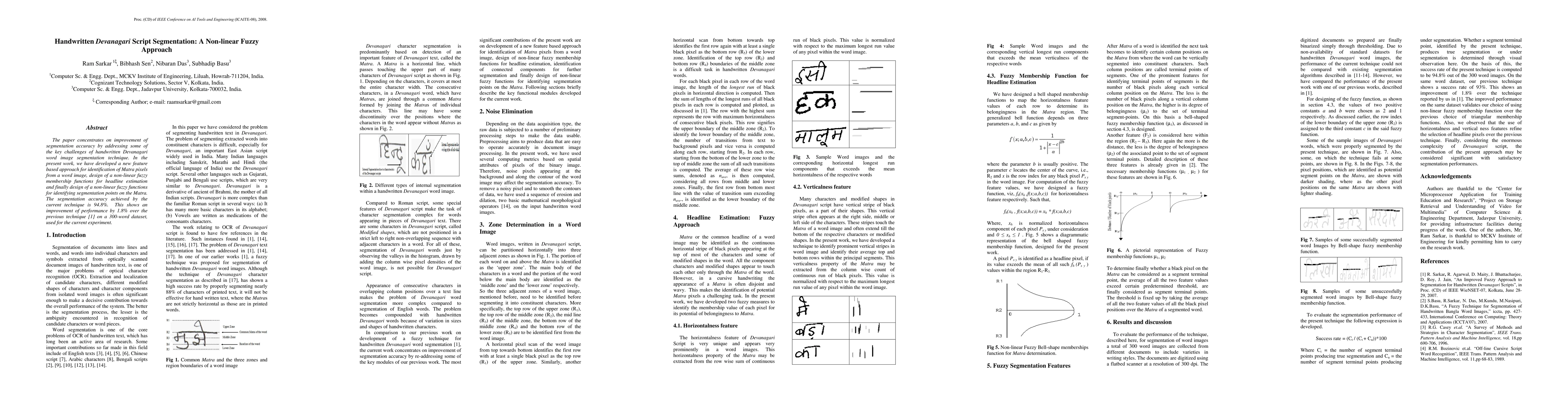 This paper introduces a new feature-based method for segmenting handwritten Devanagari script, utilizing non-linear fuzzy membership functions to enhance segmentation accuracy, achieving 94.8% accuracy, a 1.8% improvement over previous methods on a 300-word dataset.