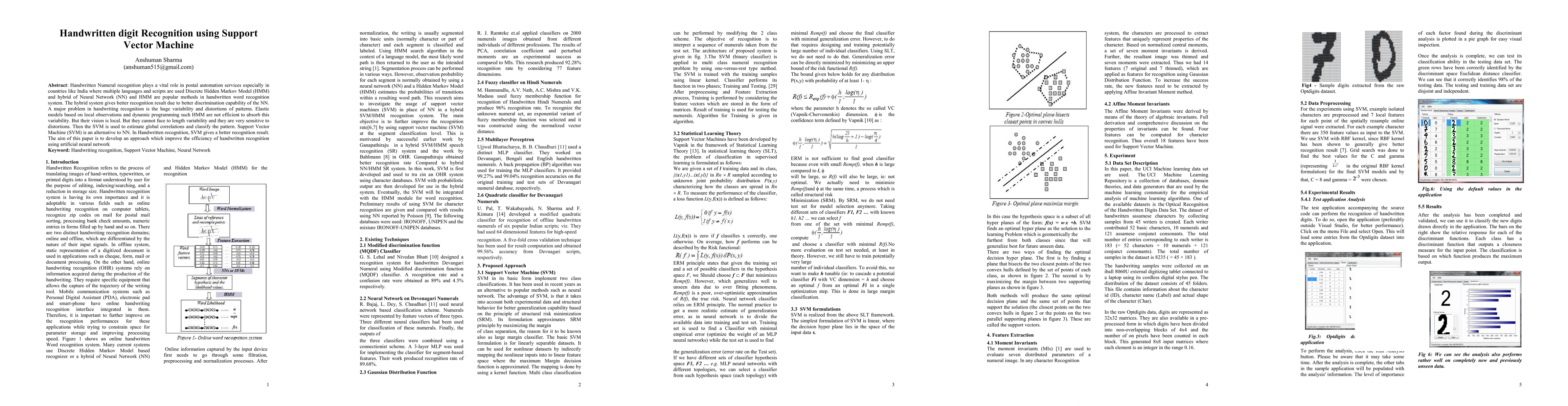 This paper explores using Support Vector Machines (SVM) for improved handwritten digit recognition, noting that traditional methods like Neural Networks (NN) and Hidden Markov Models (HMM) struggle with pattern variability and distortions. The proposed SVM approach aims to better classify global correlations, thereby enhancing recognition efficiency.