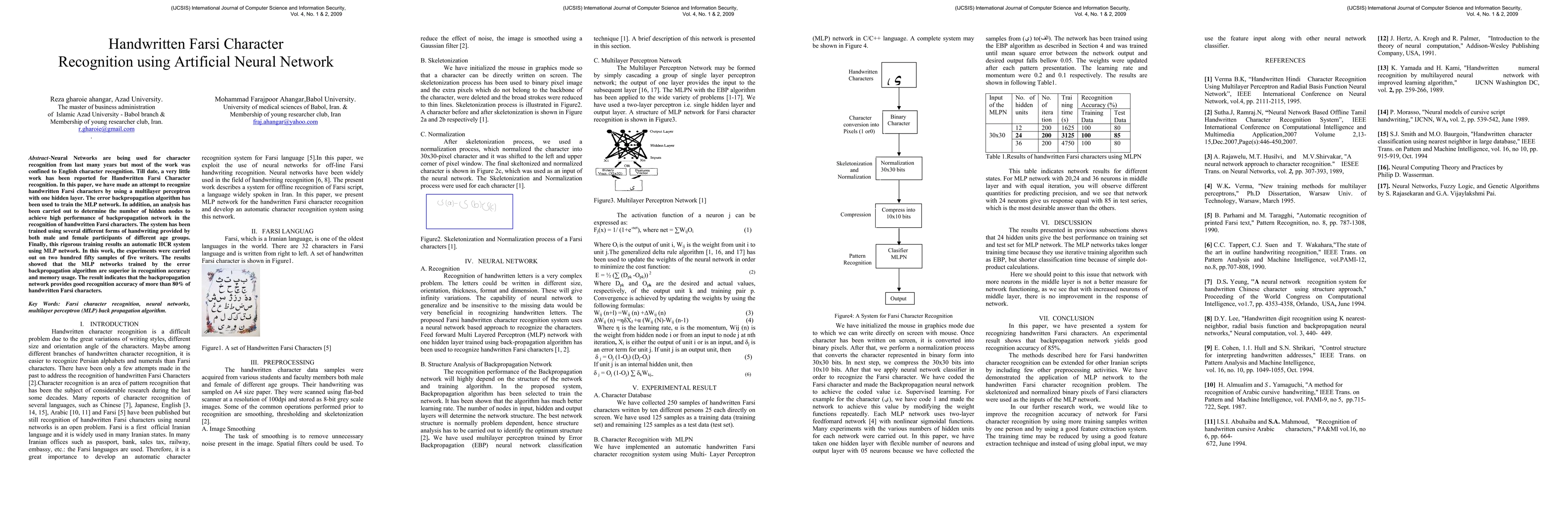 This paper explores the use of a multilayer perceptron (MLP) with backpropagation for recognizing handwritten Farsi characters, demonstrating superior accuracy over 80% compared to other methods. The study also investigates the optimal number of hidden nodes for effective training.