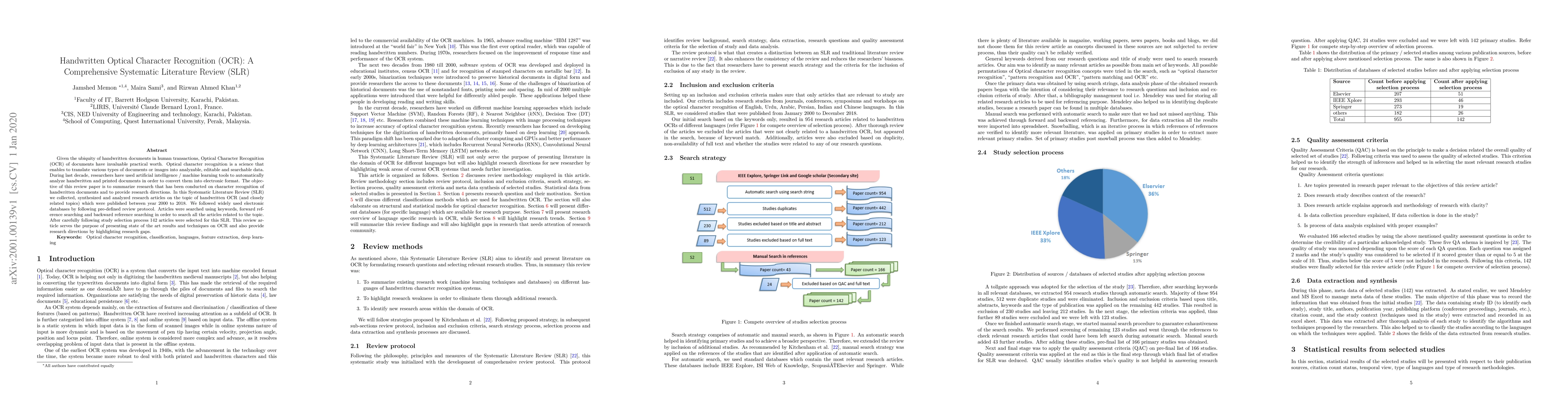 Given the ubiquity of handwritten documents in human transactions, Optical Character Recognition (OCR) of documents have invaluable practical worth. Optical character recognition is a science that enables to translate various types of documents or images into analyzable, editable and searchable data. During last decade, researchers have used artificial intelligence / machine learning tools to automatically analyze handwritten and printed documents in order to convert them into electronic format. The objective of this review paper is to summarize research that has been conducted on character recognition of handwritten documents and to provide research directions. In this Systematic Literature Review (SLR) we collected, synthesized and analyzed research articles on the topic of handwritten OCR (and closely related topics) which were published between year 2000 to 2018. We followed widely used electronic databases by following pre-defined review protocol. Articles were searched using keywords, forward reference searching and backward reference searching in order to search all the articles related to the topic. After carefully following study selection process 142 articles were selected for this SLR. This review article serves the purpose of presenting state of the art results and techniques on OCR and also provide research directions by highlighting research gaps.