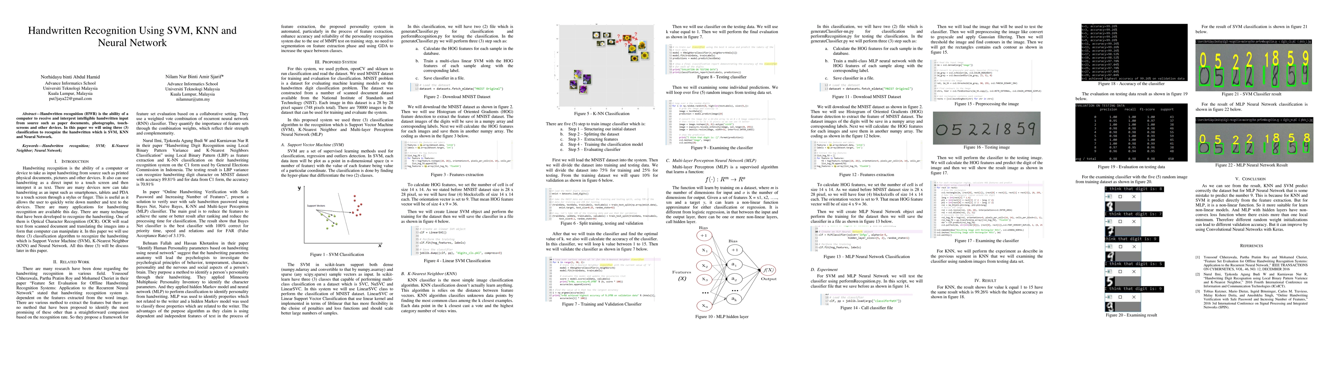 Handwritten recognition (HWR) is the ability of a computer to receive and interpret intelligible handwritten input from source such as paper documents, photographs, touch-screens and other devices. In this paper we will using three (3) classification t o re cognize the handwritten which is SVM, KNN and Neural Network.