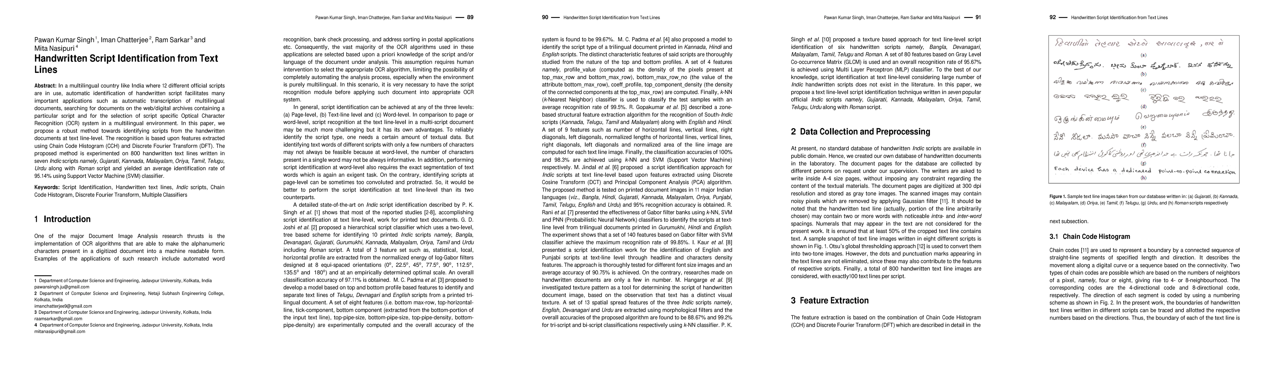 This paper proposes a method for identifying handwritten scripts from text lines in multilingual documents, using features extracted via Chain Code Histogram and Discrete Fourier Transform. The approach achieved an average identification rate of 95.14% for seven Indic scripts and Roman script using a Support Vector Machine classifier.