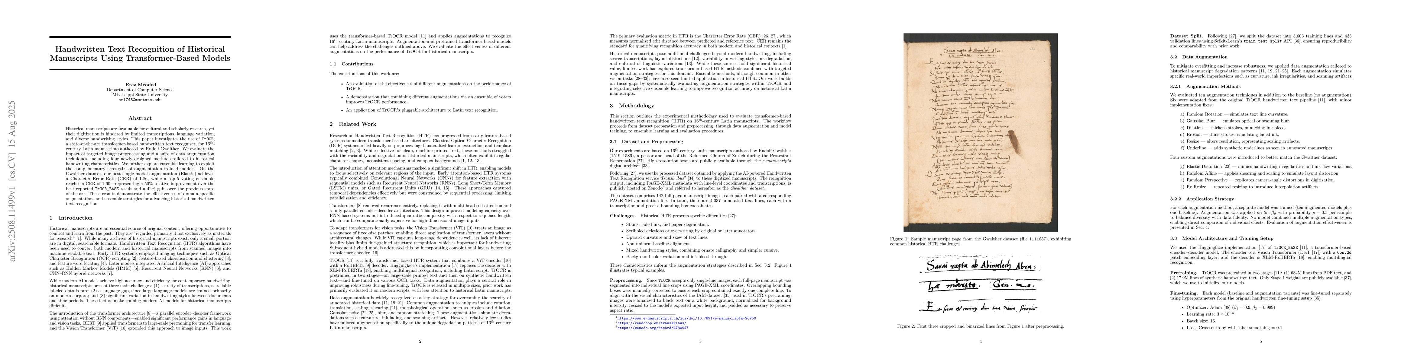 Historical handwritten text recognition (HTR) is essential for unlocking the cultural and scholarly value of archival documents, yet digitization is often hindered by scarce transcriptions, linguistic variation, and highly diverse handwriting styles. In this study, we apply TrOCR, a state-of-the-art transformer-based HTR model, to 16th-century Latin manuscripts authored by Rudolf Gwalther. We investigate targeted image preprocessing and a broad suite of data augmentation techniques, introducing four novel augmentation methods designed specifically for historical handwriting characteristics. We also evaluate ensemble learning approaches to leverage the complementary strengths of augmentation-trained models. On the Gwalther dataset, our best single-model augmentation (Elastic) achieves a Character Error Rate (CER) of 1.86, while a top-5 voting ensemble achieves a CER of 1.60 - representing a 50% relative improvement over the best reported TrOCR_BASE result and a 42% improvement over the previous state of the art. These results highlight the impact of domain-specific augmentations and ensemble strategies in advancing HTR performance for historical manuscripts.