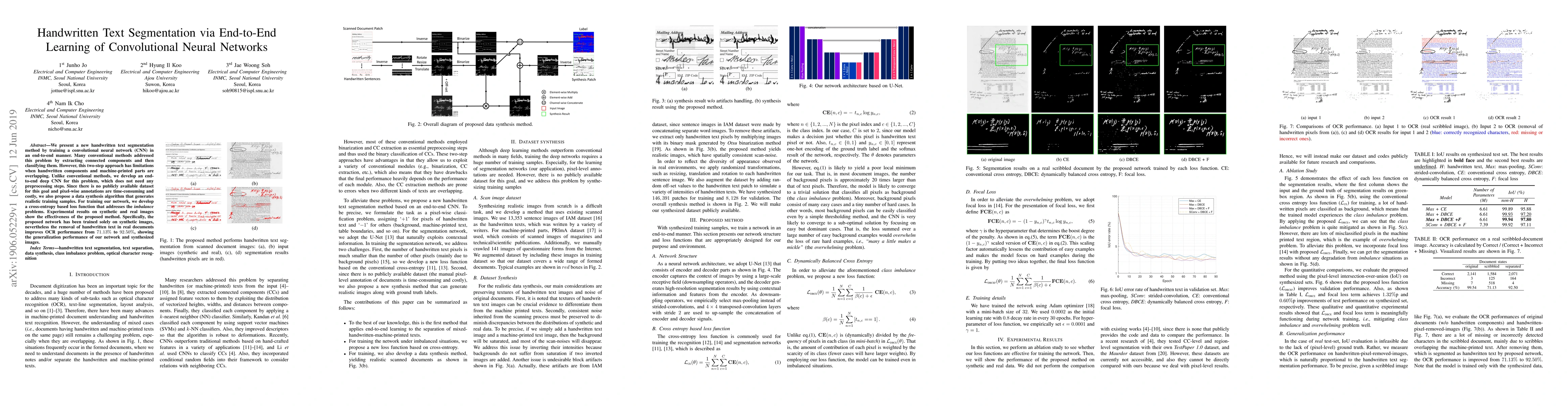 This paper introduces an end-to-end convolutional neural network (CNN) for handwritten text segmentation without preprocessing, addressing the limitations of two-step methods. It also proposes a data synthesis algorithm and a cross-entropy loss function to tackle imbalance, demonstrating improved OCR performance from 71.13% to 92.50% on real documents.