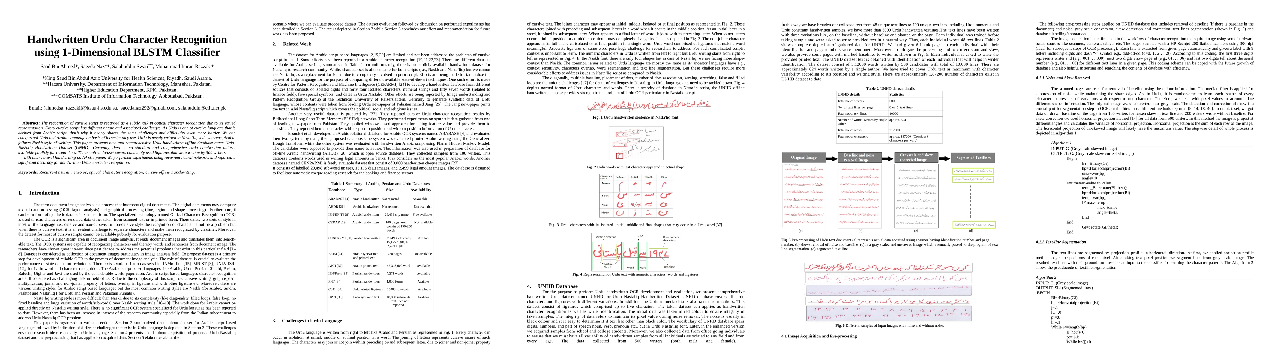 The paper introduces a new Urdu handwritten offline dataset named UNHD and employs a 1-Dimensional BLSTM classifier for recognizing cursive Urdu characters, achieving notable accuracy despite the challenges of cursive script representation.