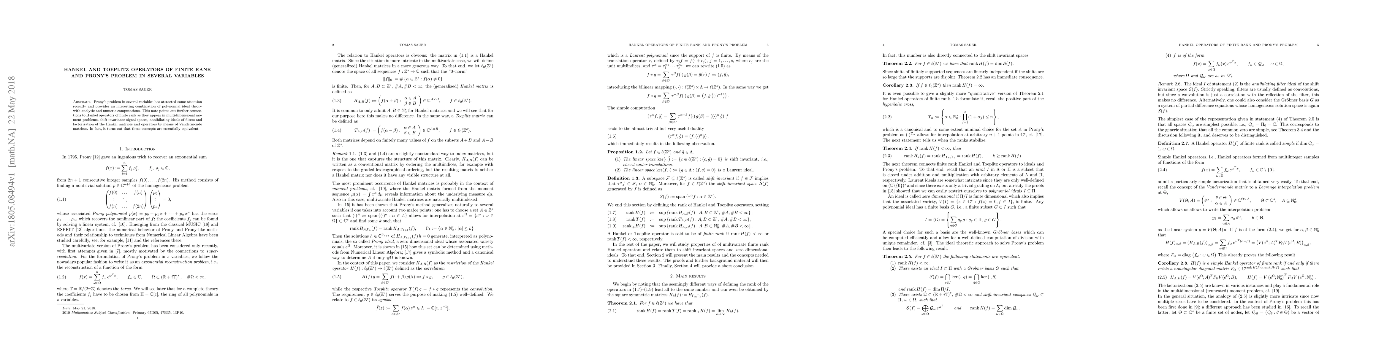 Summary: This paper explores the connections between Prony's problem in several variables and Hankel operators of finite rank, revealing equivalences in multidimensional moment problems, shift invariant signal spaces, and factorization via Vandermonde matrices. The study combines polynomial ideal theory with analytic and numeric techniques.