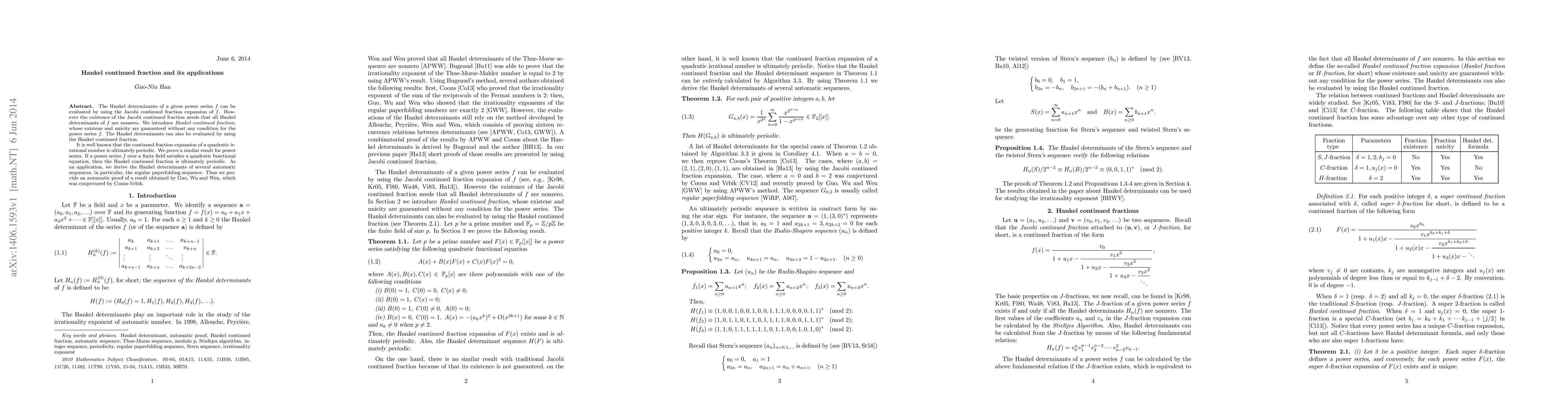 This paper introduces the Hankel continued fraction, a new method for evaluating Hankel determinants of power series without requiring all determinants to be nonzero. It proves that if a power series satisfies a quadratic functional equation over a finite field, its Hankel continued fraction is ultimately periodic, and applies this to derive the Hankel determinants of automatic sequences like the regular paperfolding sequence.