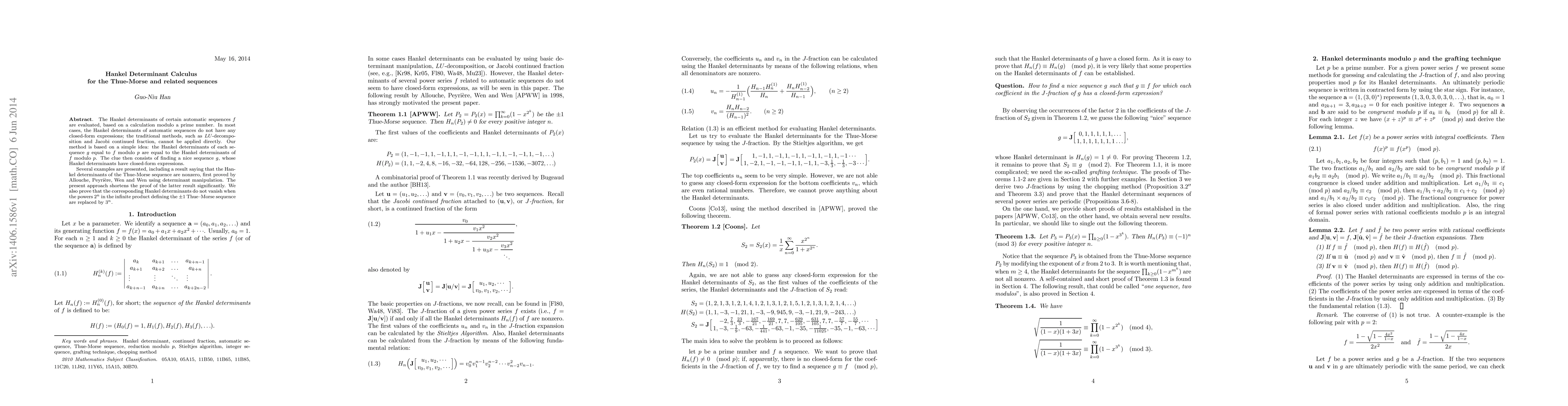 The Hankel determinants of certain automatic sequences $f$ are evaluated, based on a calculation modulo a prime number. In most cases, the Hankel determinants of automatic sequences do not have any closed-form expressions; the traditional methods, such as $LU$-decompo\-si\-tion and Jacobi continued fraction, cannot be applied directly. Our method is based on a simple idea: the Hankel determinants of each sequence $g$ equal to $f$ modulo $p$ are equal to the Hankel determinants of $f$ modulo $p$. The clue then consists of finding a nice sequence $g$, whose Hankel determinants have closed-form expressions. Several examples are presented, including a result saying that the Hankel determinants of the Thue-Morse sequence are nonzero, first proved by Allouche, Peyri\`ere, Wen and Wen using determinant manipulation. The present approach shortens the proof of the latter result significantly. We also prove that the corresponding Hankel determinants do not vanish when the powers $2^n$ in the infinite product defining the $\pm 1$ Thue--Morse sequence are replaced by $3^n$.