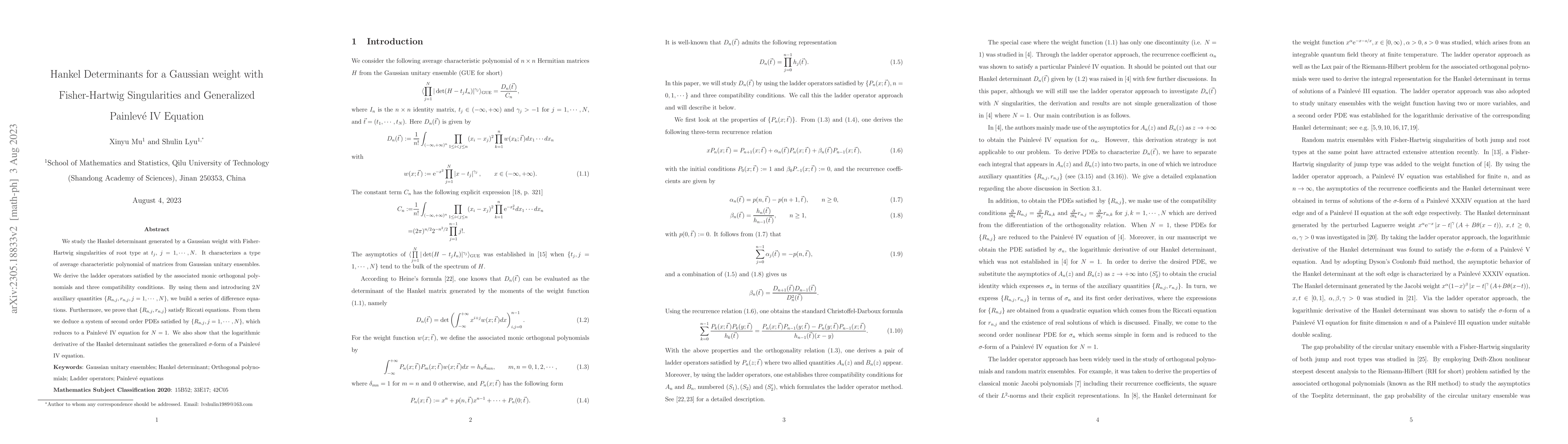 This paper investigates Hankel determinants with Gaussian weights and Fisher-Hartwig singularities, deriving associated ladder operators and compatibility conditions. It ultimately connects these to a generalized Painlevé IV equation through a series of difference equations and Riccati equations.