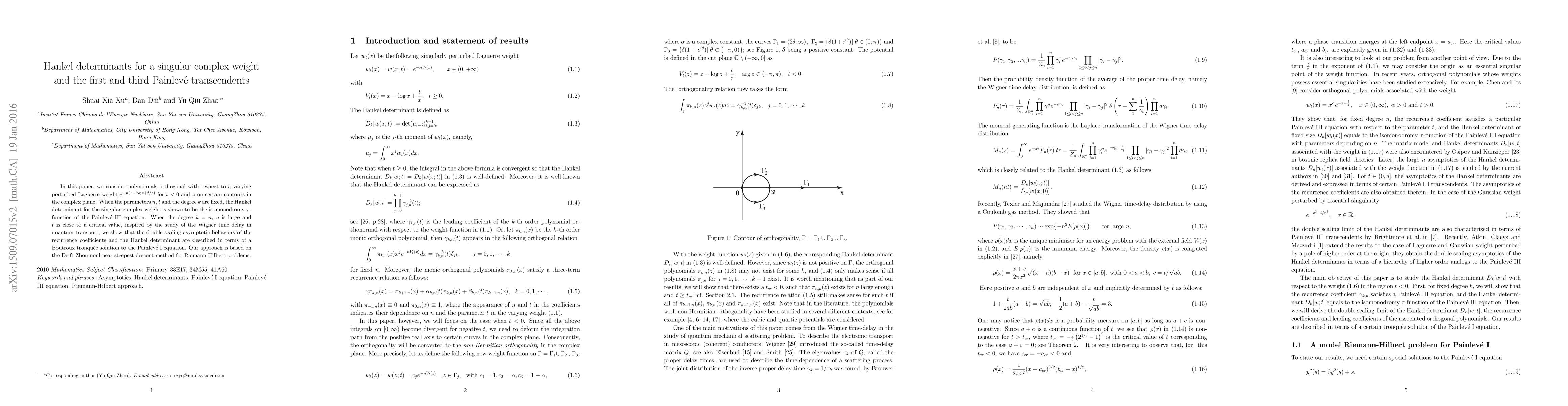 In this paper, we consider polynomials orthogonal with respect to a varying perturbed Laguerre weight $e^{-n(z-\log z+t/z)}$ for $t<0$ and $z$ on certain contours in the complex plane. When the parameters $n$, $t$ and the degree $k$ are fixed, the Hankel determinant for the singular complex weight is shown to be the isomonodromy $\tau$-function of the Painlev\'e III equation. When the degree $k=n$, $n$ is large and $t$ is close to a critical value, inspired by the study of the Wigner time delay in quantum transport, we show that the double scaling asymptotic behaviors of the recurrence coefficients and the Hankel determinant are described in terms of a Boutroux tronqu\'ee solution to the Painlev\'e I equation. Our approach is based on the Deift-Zhou nonlinear steepest descent method for Riemann-Hilbert problems.