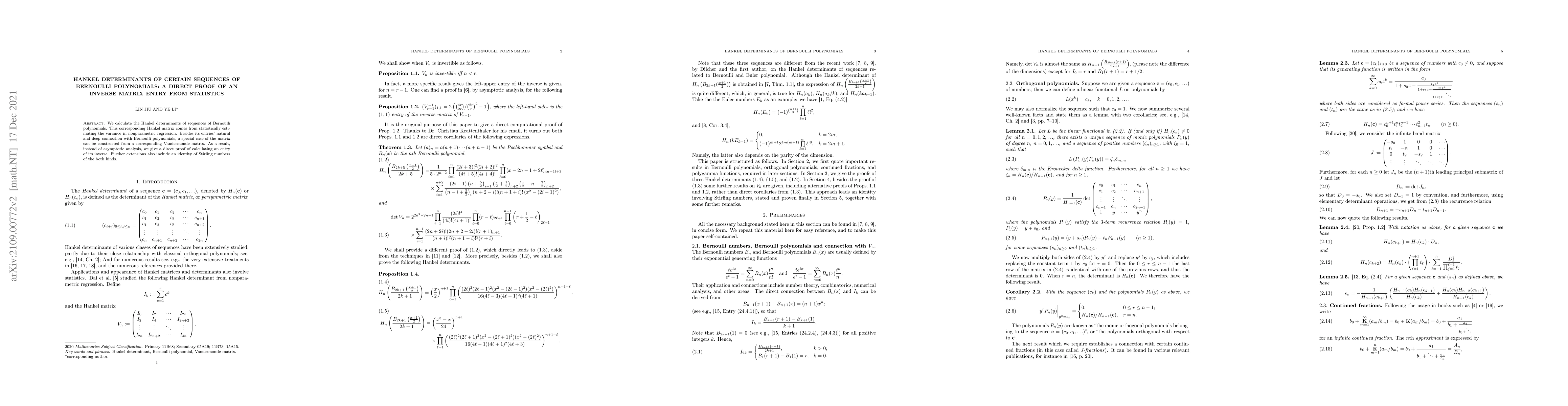 This paper calculates Hankel determinants of Bernoulli polynomial sequences, linking them to variance estimation in nonparametric regression. It provides a direct proof for an entry of the inverse of the corresponding matrix, avoiding asymptotic analysis.