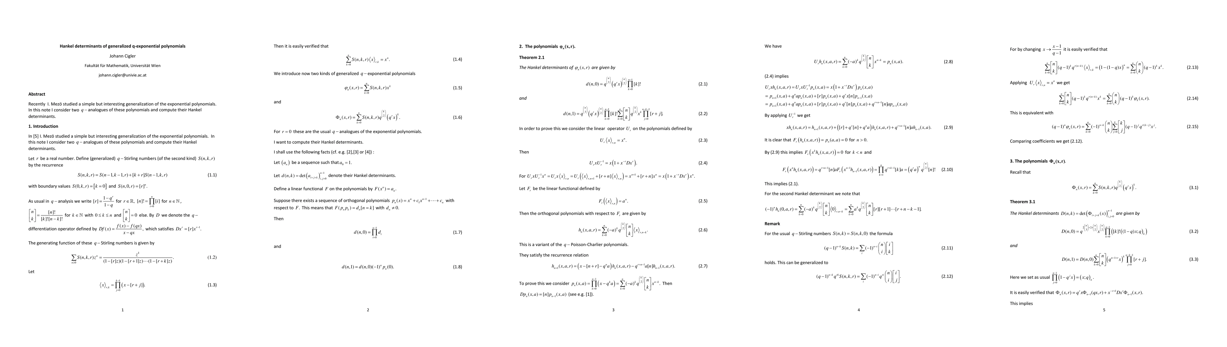 Recently I. Mezo studied a simple but interesting generalization of the exponential polynomials. In this note I consider two q-analogues of these polynomials and compute their Hankel determinants.