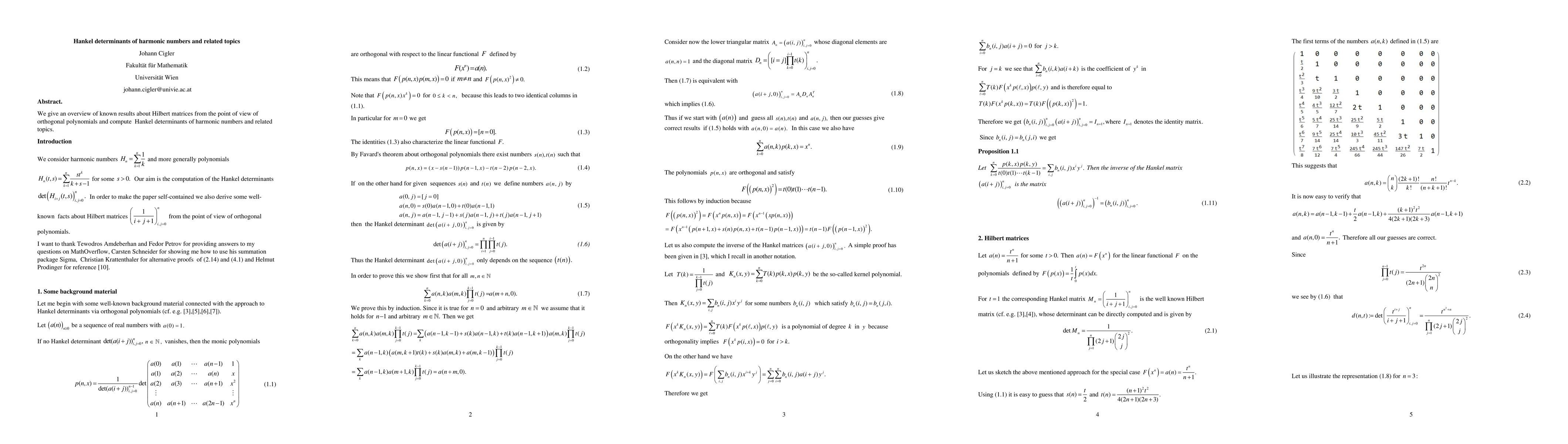 This paper reviews results on Hilbert matrices through the lens of orthogonal polynomials and calculates Hankel determinants for harmonic numbers and associated sequences.