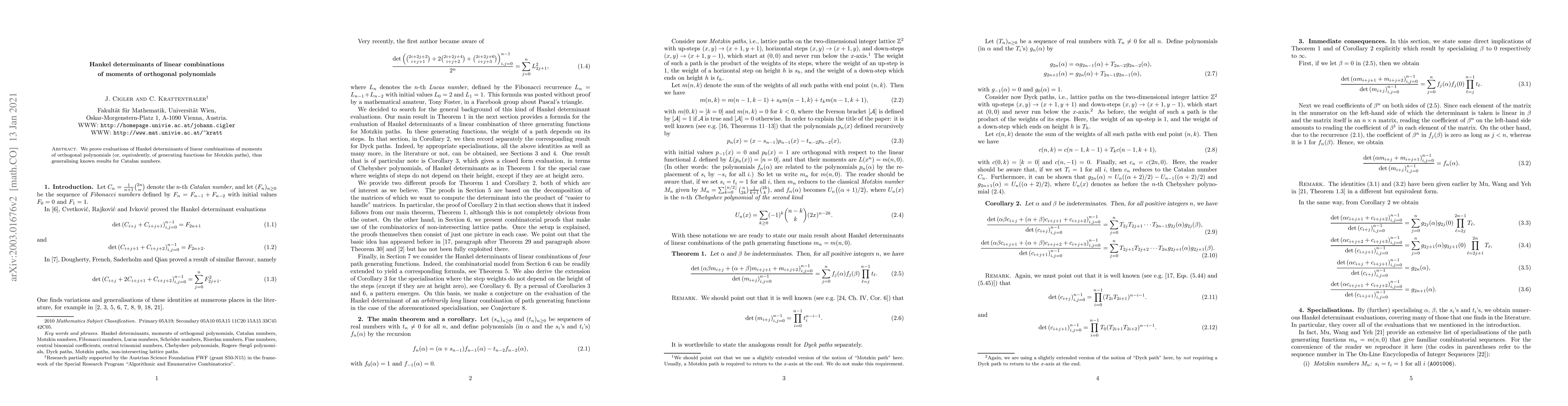 Two-line summary: This paper evaluates Hankel determinants of linear combinations of moments of orthogonal polynomials, extending known results related to Catalan numbers and providing new insights into generating functions for Motzkin paths. The evaluations generalize existing findings in the field.