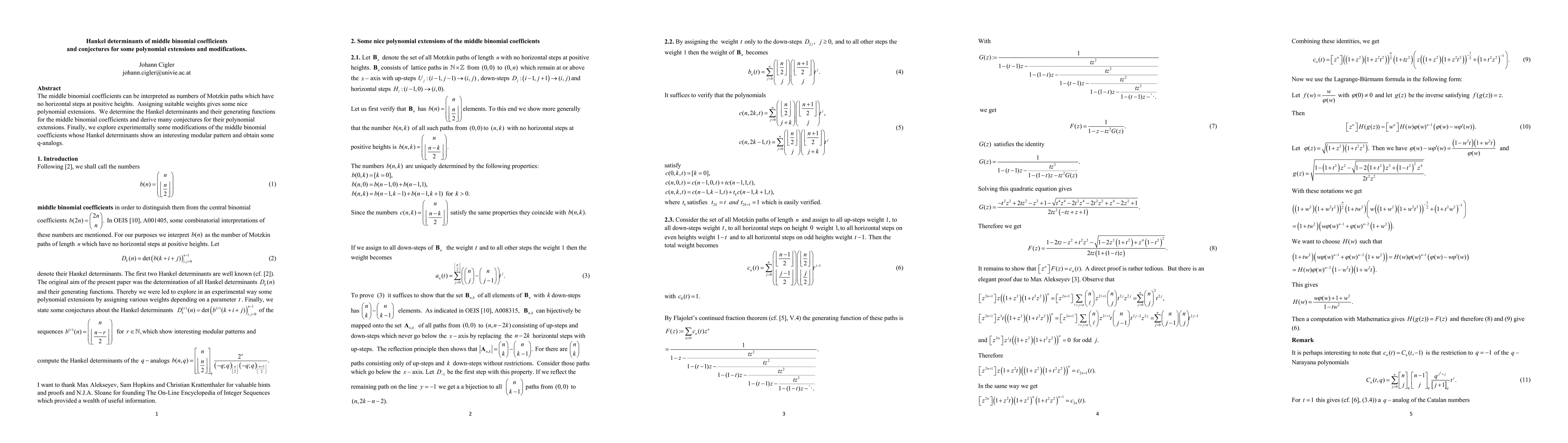 This paper investigates the Hankel determinants of middle binomial coefficients, which count Motzkin paths with no horizontal steps at positive heights. It explores polynomial extensions and modifications, deriving conjectures and discovering interesting modular patterns in experimentally obtained q-analogs.