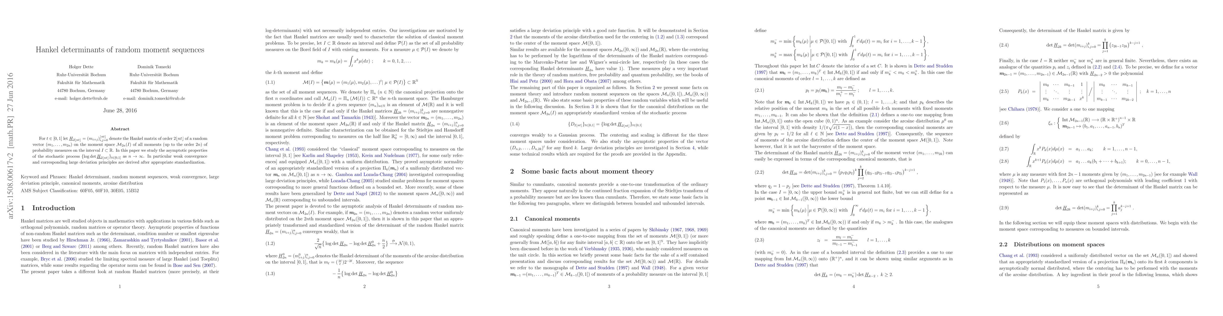 This paper investigates the asymptotic properties of a stochastic process related to Hankel determinants of random moment sequences, focusing on weak convergence and large deviation principles as n approaches infinity.