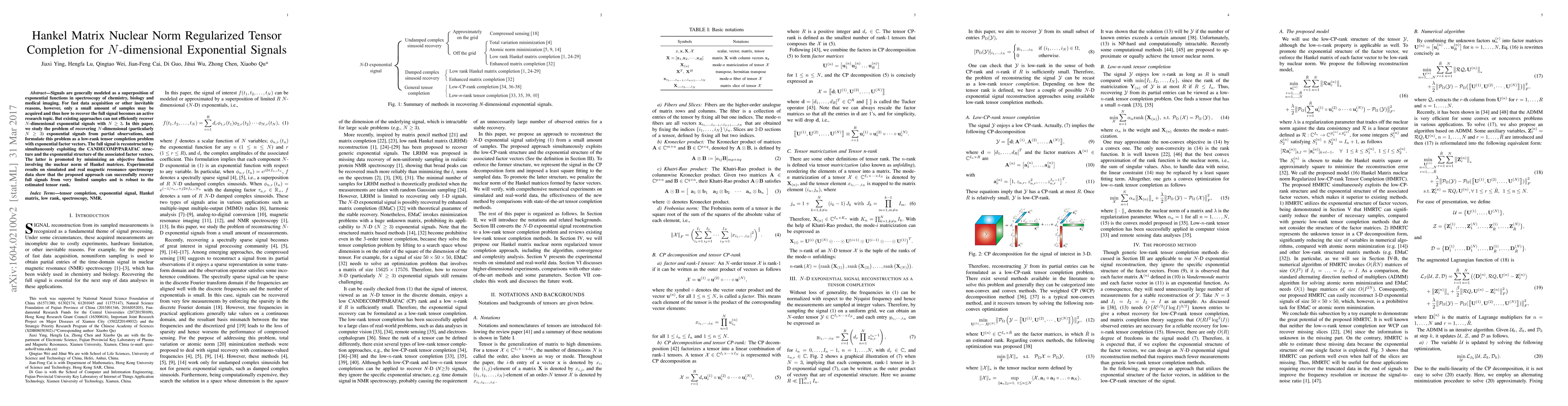 This paper proposes a method for reconstructing N-dimensional exponential signals from partial observations by leveraging both the CANDECOMP/PARAFAC structure and the exponential structure of factor vectors. The approach uses Hankel matrix nuclear norm regularization to achieve efficient recovery, demonstrating successful results on both simulated and real magnetic resonance spectroscopy data.