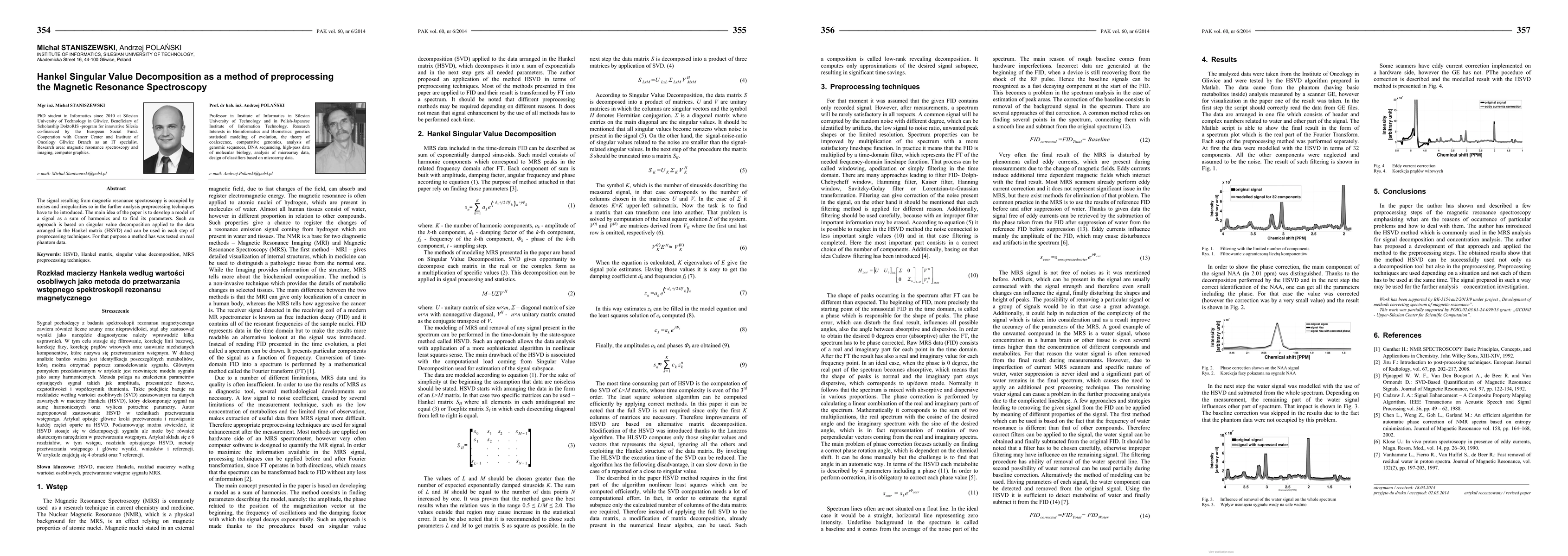 The signal resulting from magnetic resonance spectroscopy is occupied by noises and irregularities so in the further analysis preprocessing techniques have to be introduced. The main idea of the paper is to develop a model of a signal as a sum of harmonics and to find its parameters. Such an approach is based on singular value decomposition applied to the data arranged in the Hankel matrix (HSVD) and can be used in each step of preprocessing techniques. For that purpose a method has was tested on real phantom data.