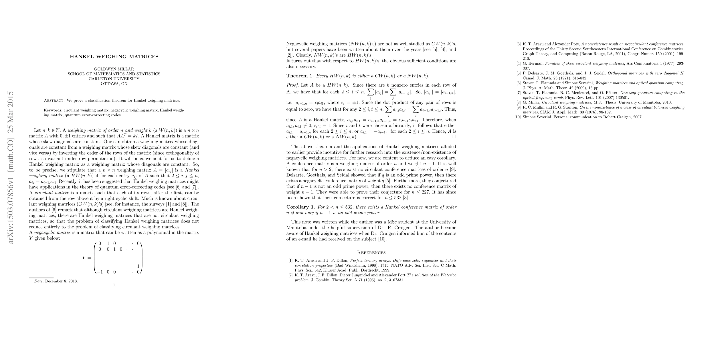 Summary: This paper presents a classification theorem for Hankel weighing matrices, providing a comprehensive understanding of their structure and properties. The findings contribute significantly to the field of matrix theory and its applications.
